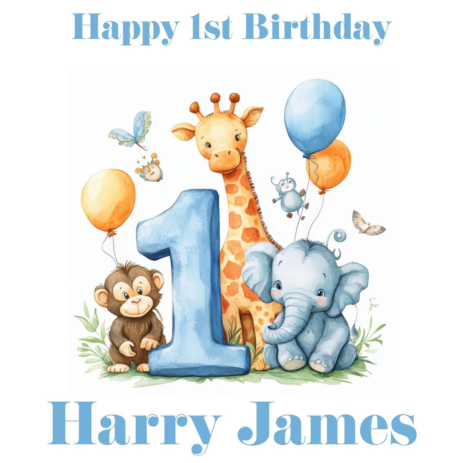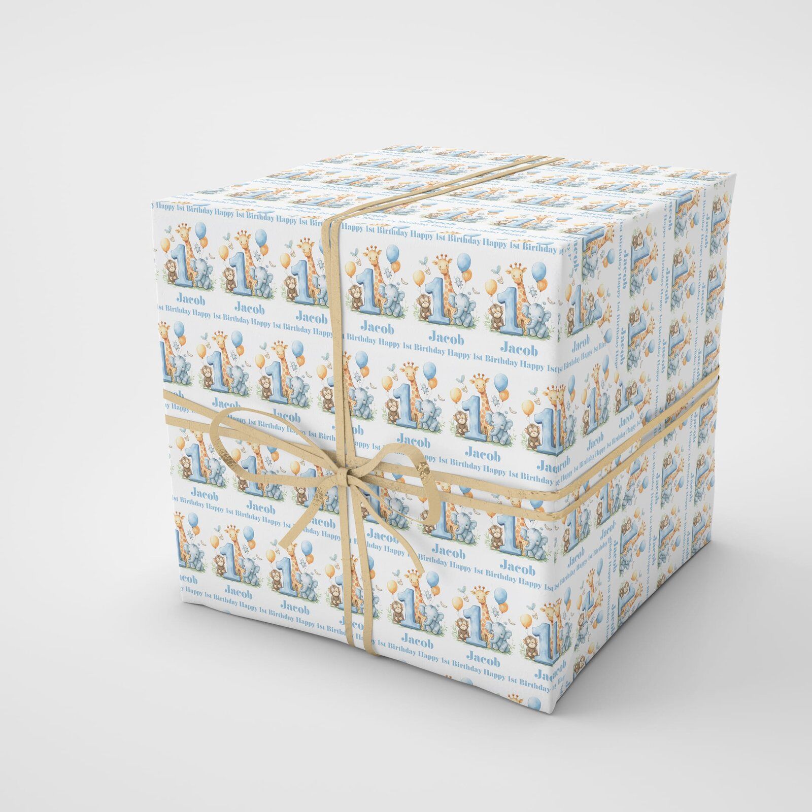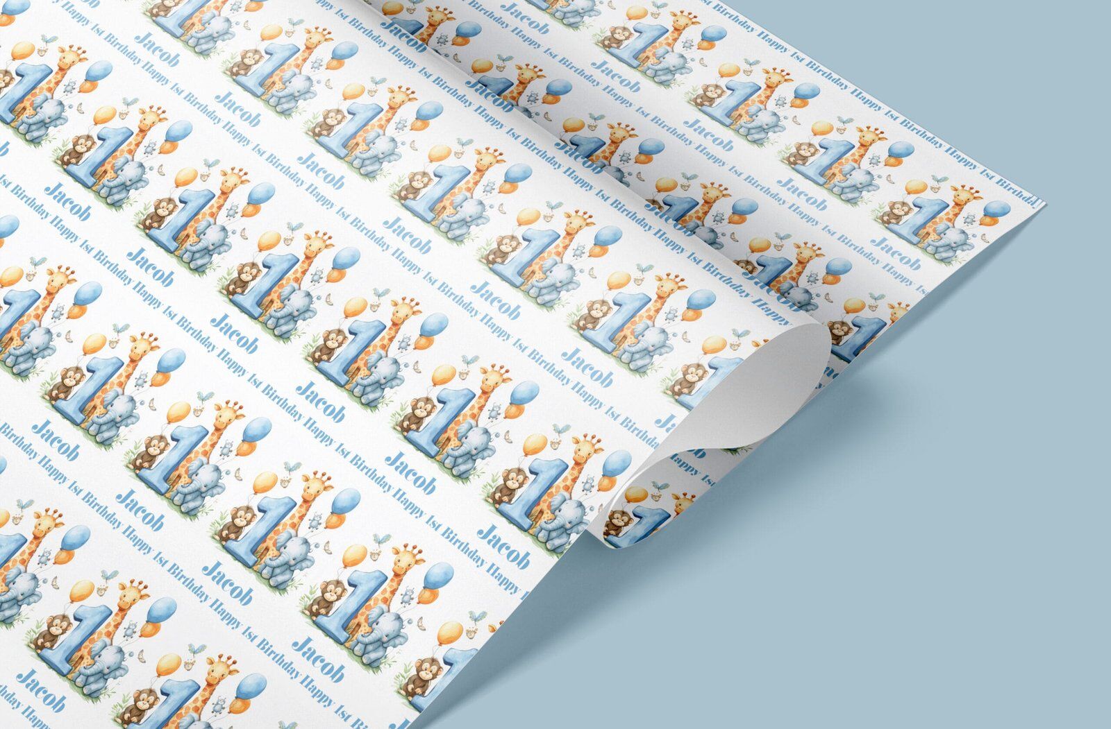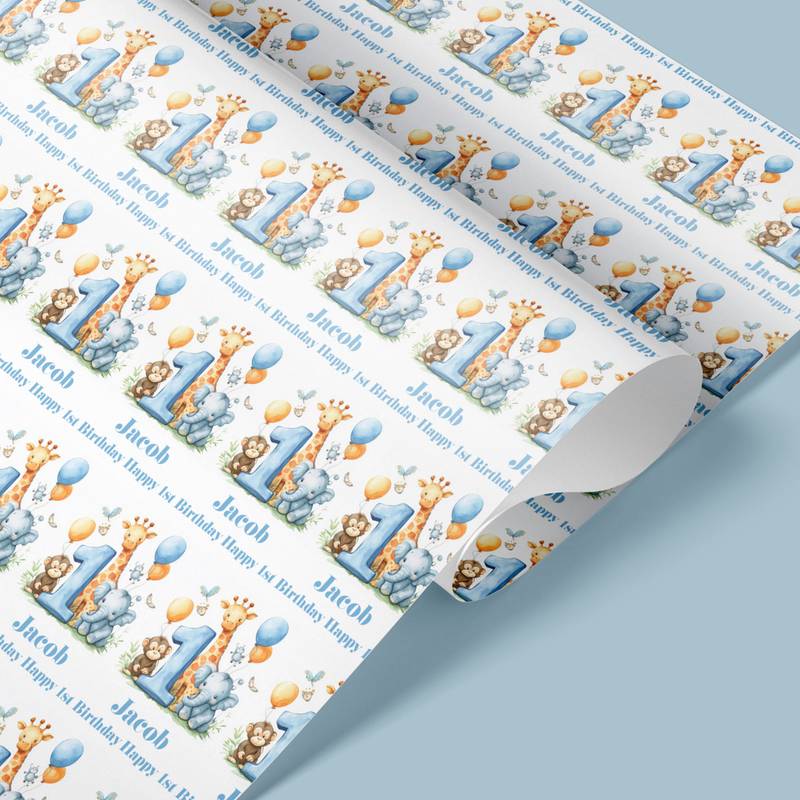 1st Birthday Blue Safari Animals Gift Wrap