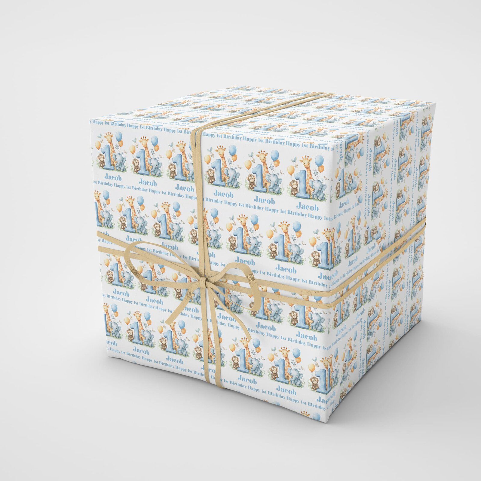 A lovely elegant personalised 1st Birthday Safari animals with blue font gift wrap, put a smile on their face, for Grandparents, Parents, friend, partner, colleague etc