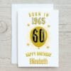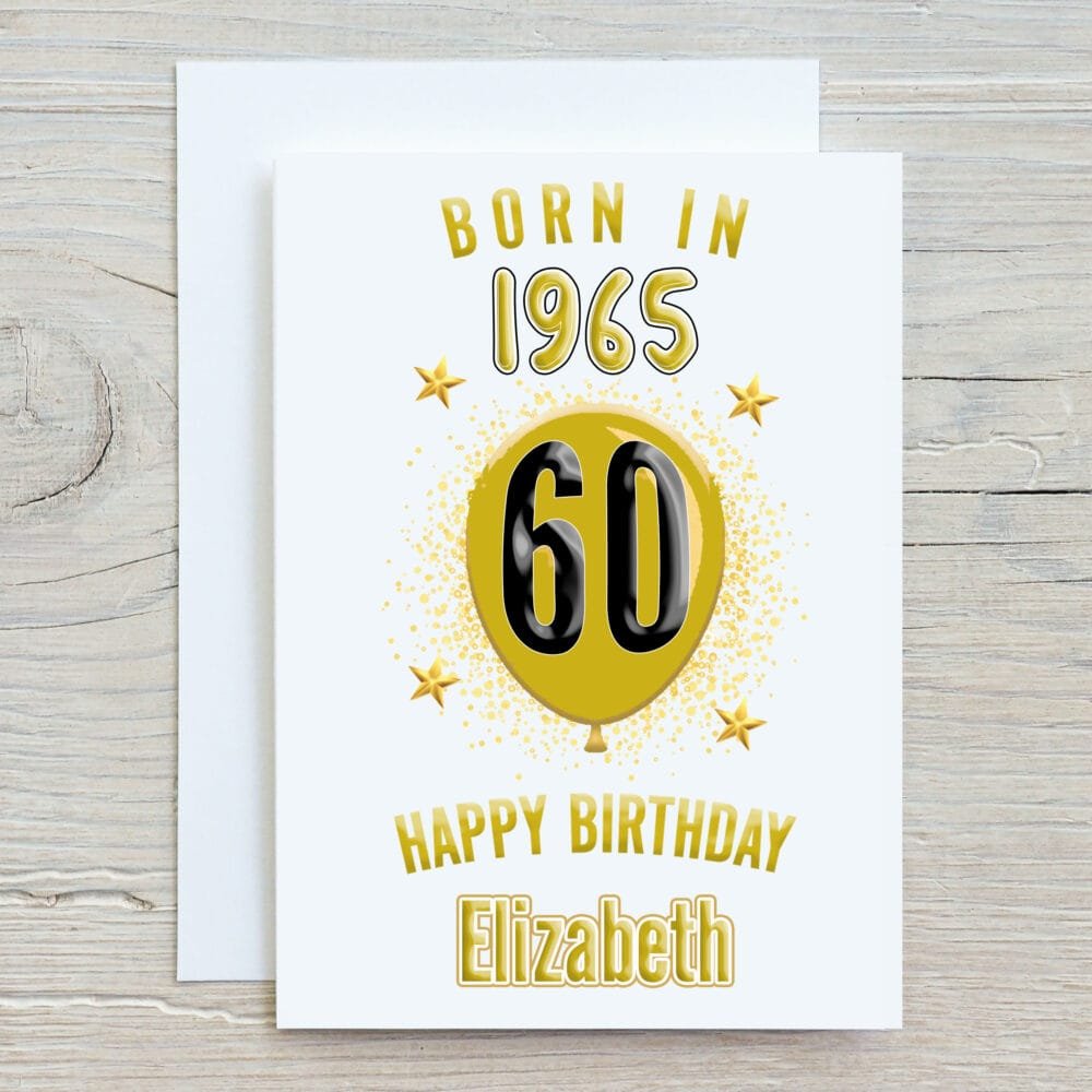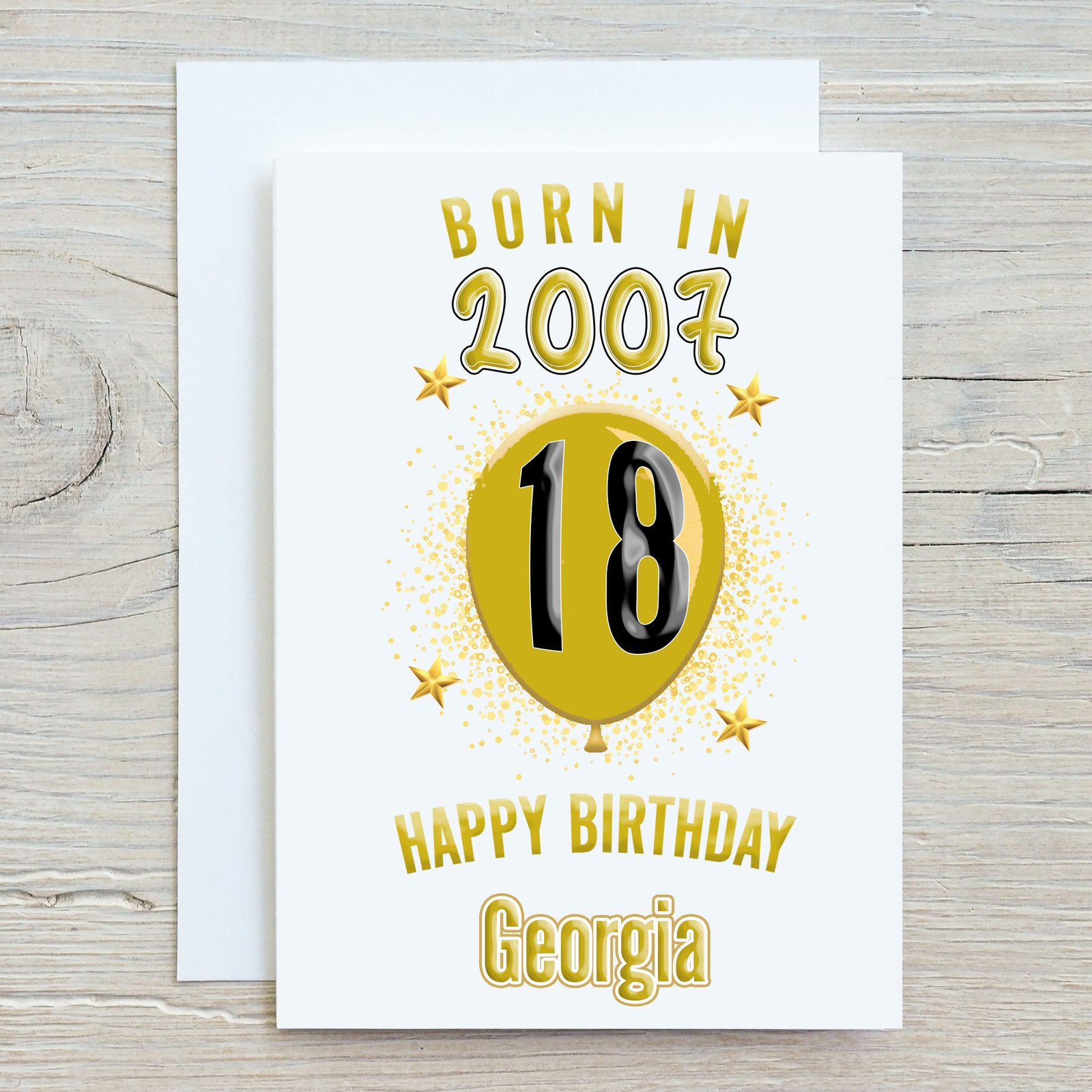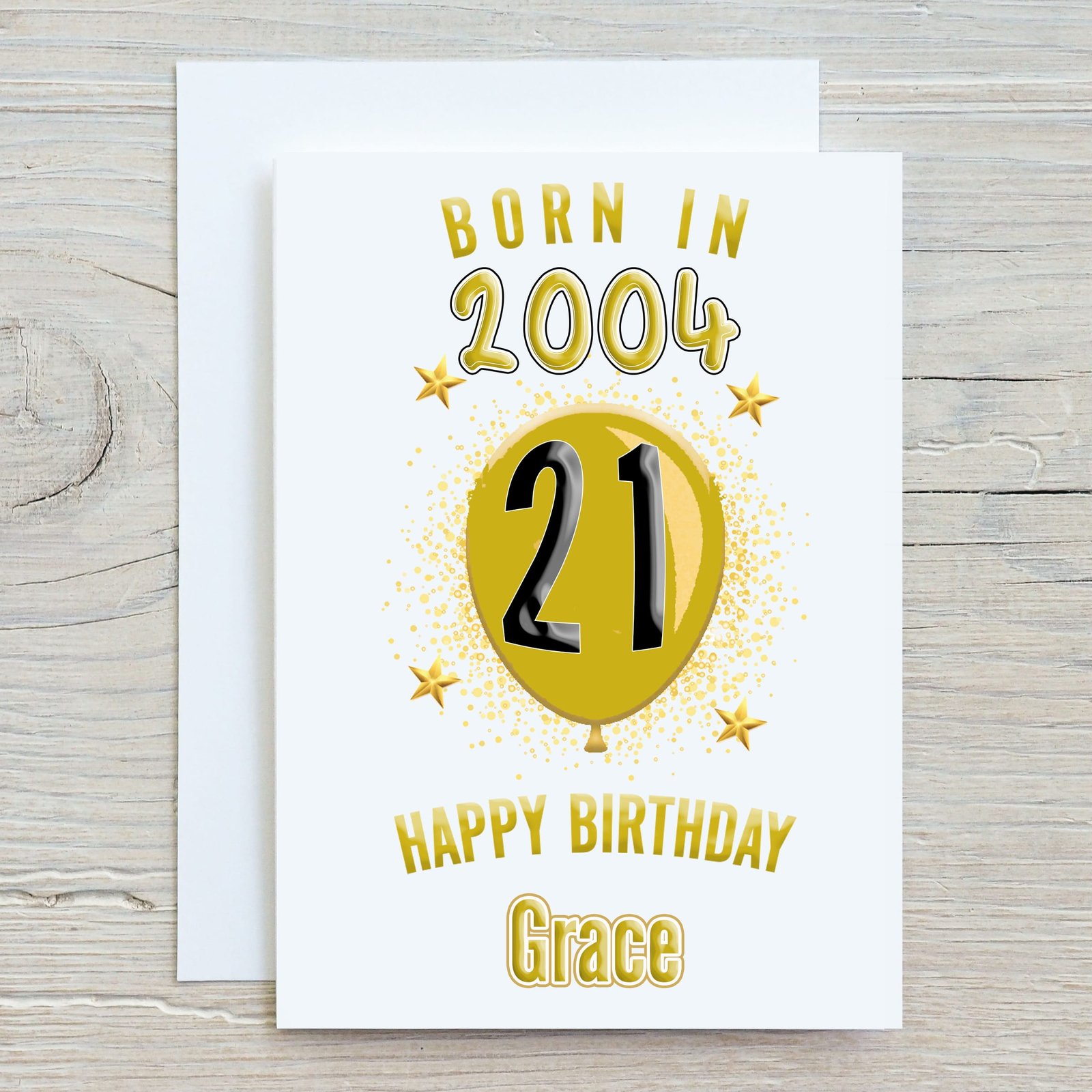 Add a touch of class with this Born in year Birthday gold balloon themed card with a year, age and name for a Son, Daughter, Nephew, Granddaughter, Grandson, father, Colleague, friend etc