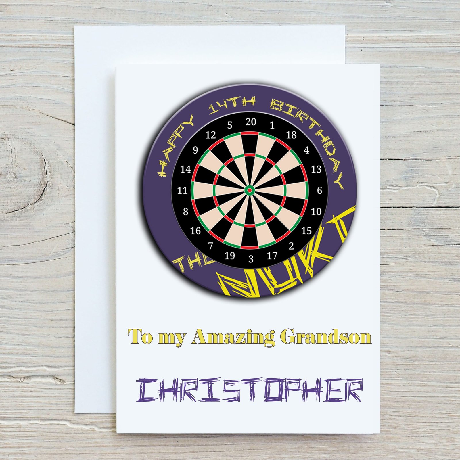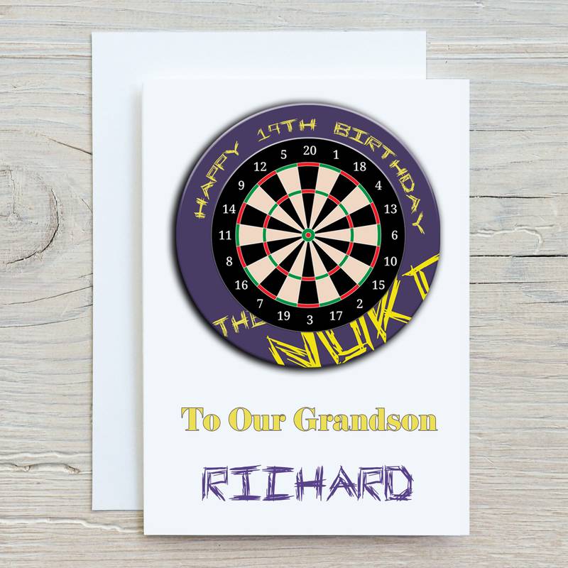 Make a birthday extra special with this colourful Darts Nuke themed Birthday card with a name and age for that special person.