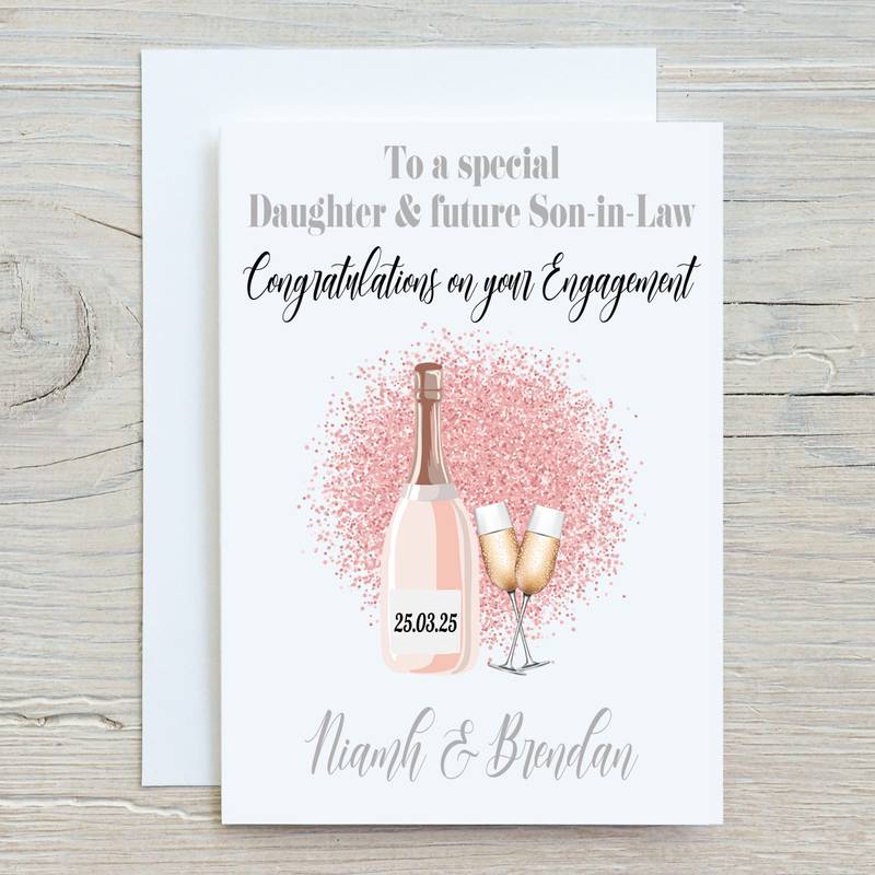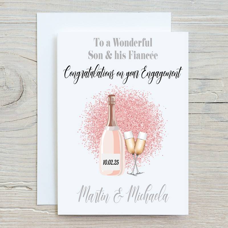 You can choose the wording for the top of the card should it be a daughter or son, their partner, fiancée or Fiancé. Choose the engagement date that is shown on the bottle and finish of with both of their names for the bottom of the card.