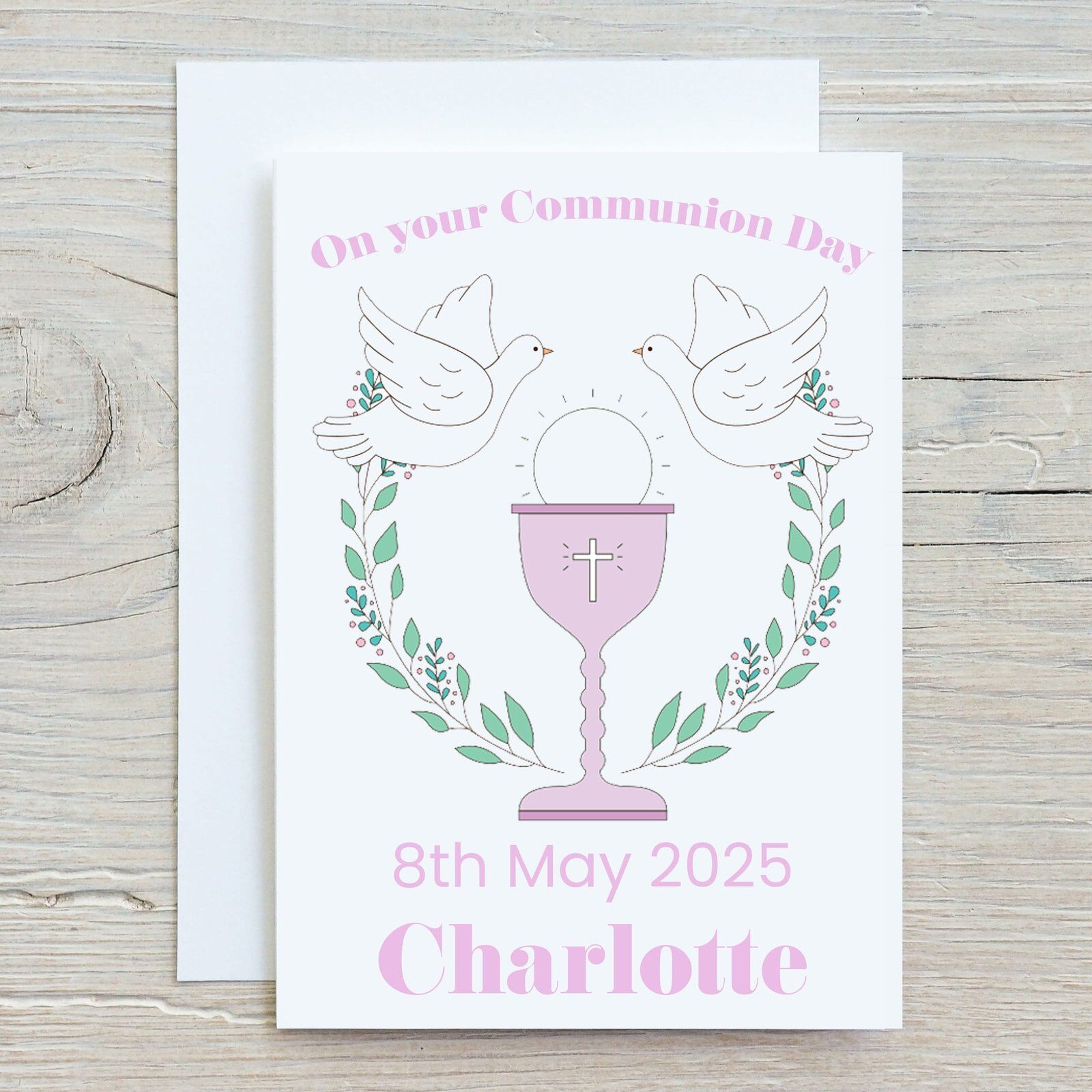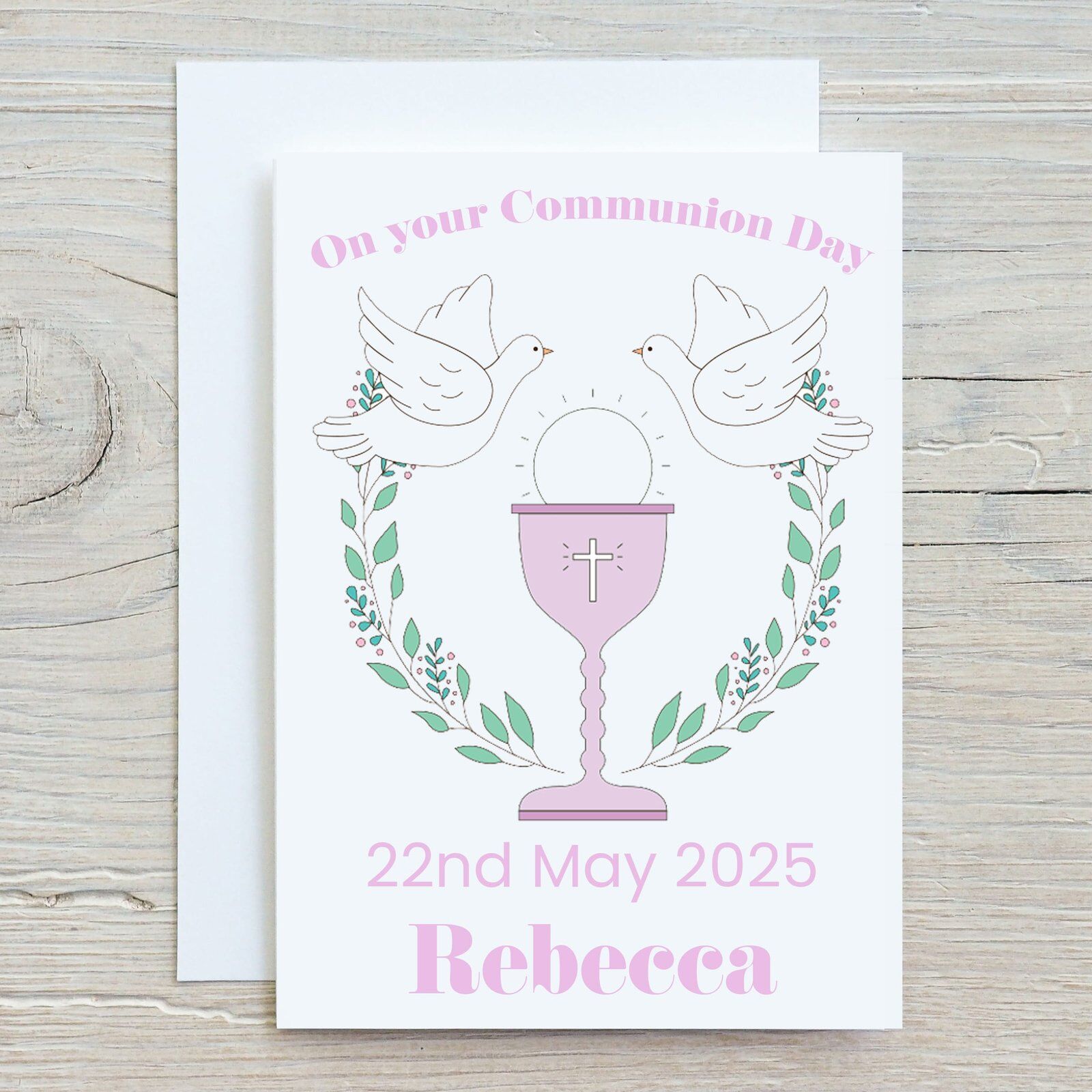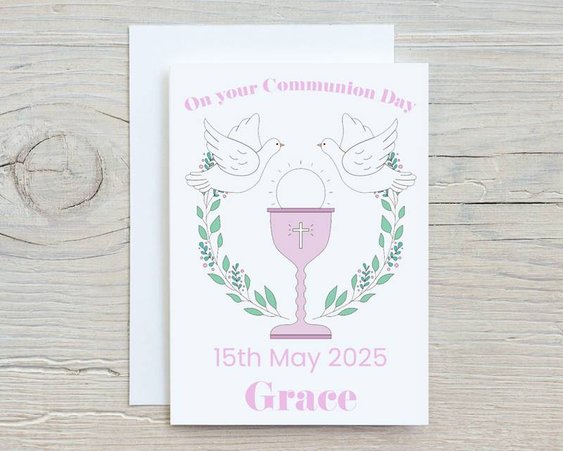 Add a touch of class with this beautiful and elegant pink themed Holy Communion card with a name and date for that special person.