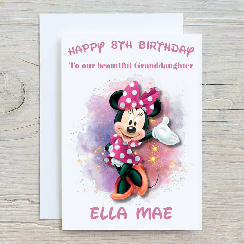 Celebrate a birthday with this colourful pink themed Minnie Mouse Greeting card with a name and age for that special person and relationship