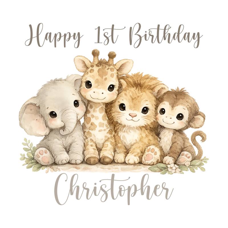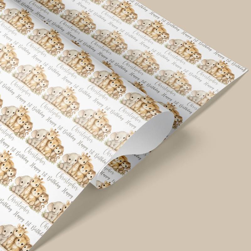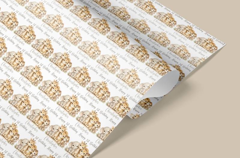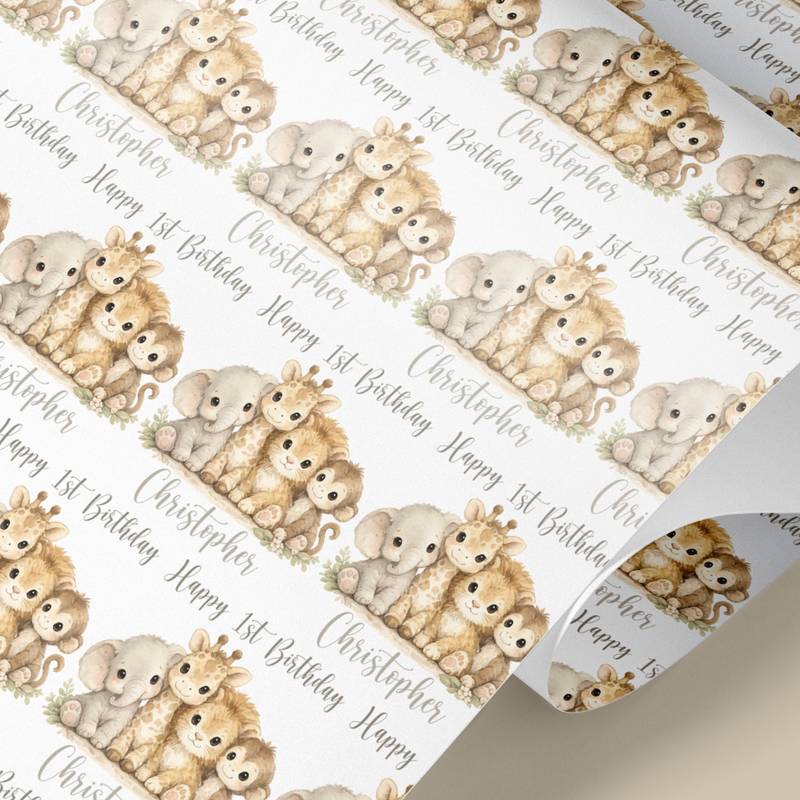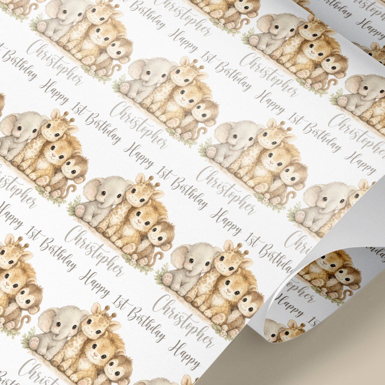 Personalised baby safari wrapping paper featuring elephant, giraffe, lion & monkey. Perfect for newborns & 1st birthdays. Eco-friendly, rolled not folded, Royal Mail tracked delivery.