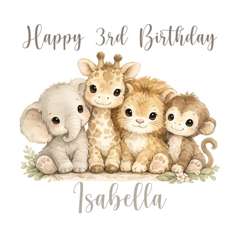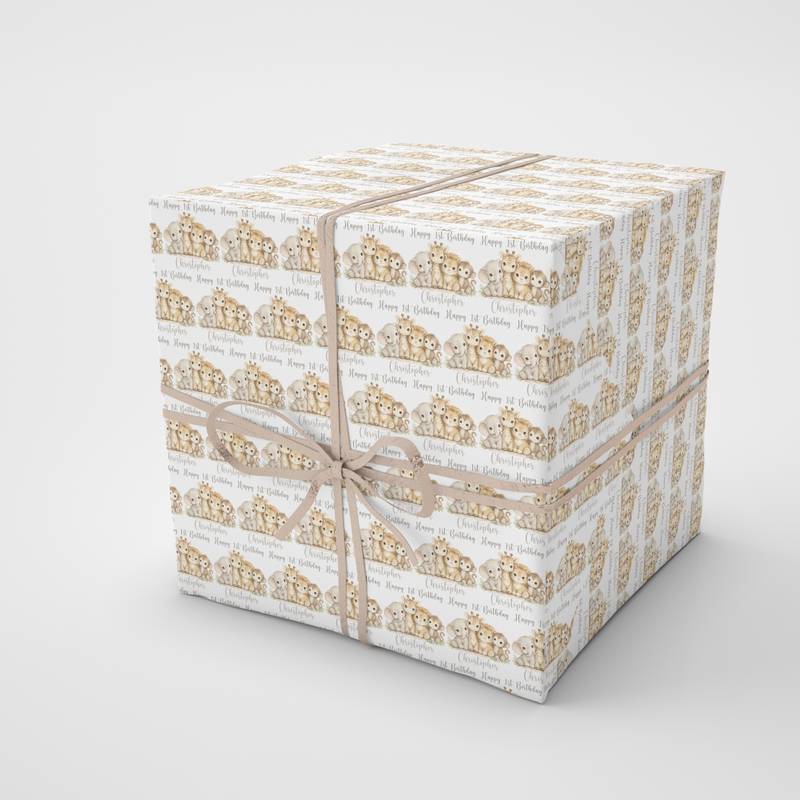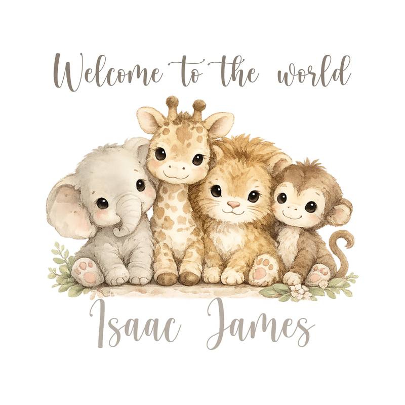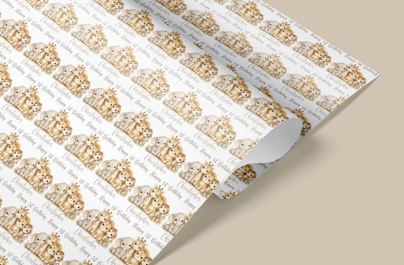 Personalised baby safari wrapping paper featuring elephant, giraffe, lion & monkey. Perfect for newborns & 1st birthdays. Eco-friendly, rolled not folded, Royal Mail tracked delivery.
