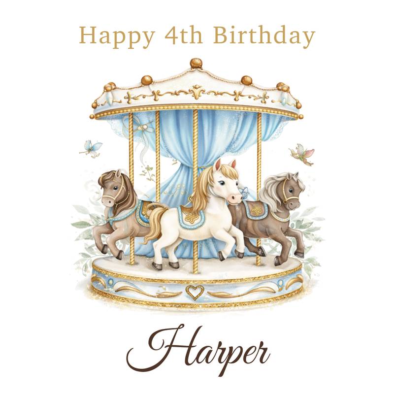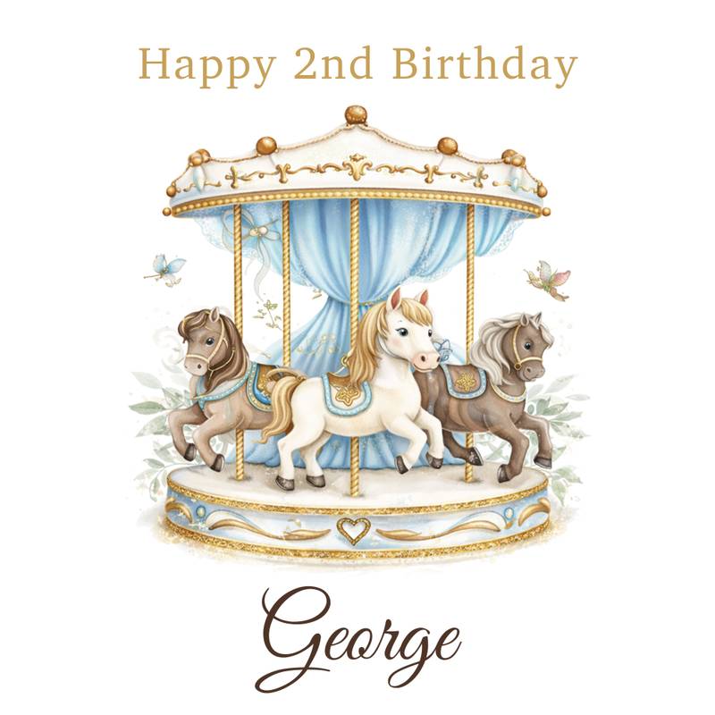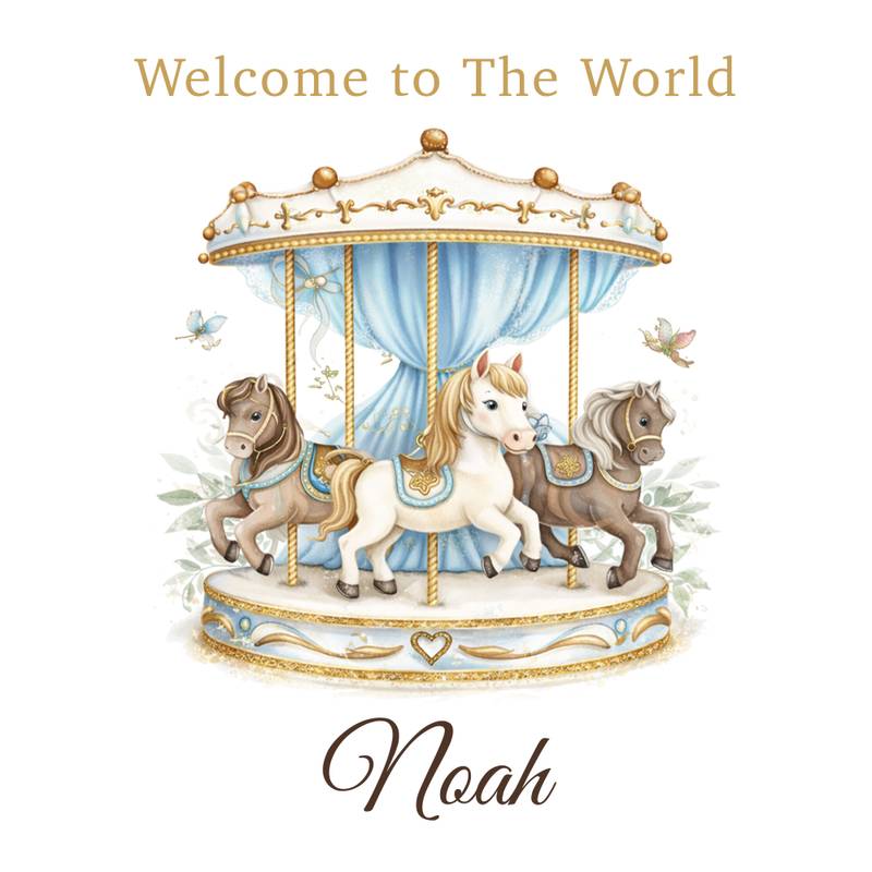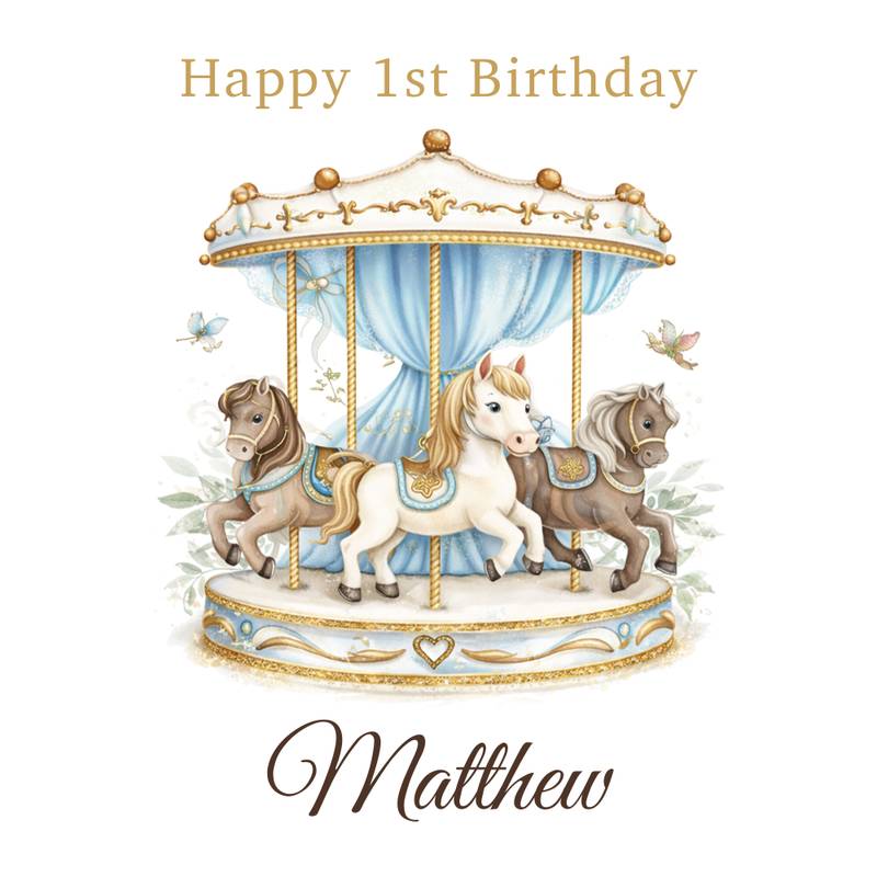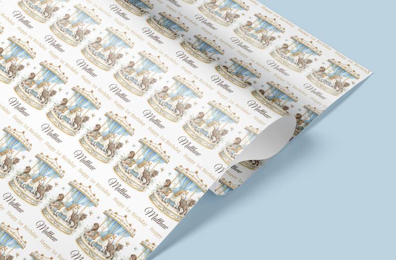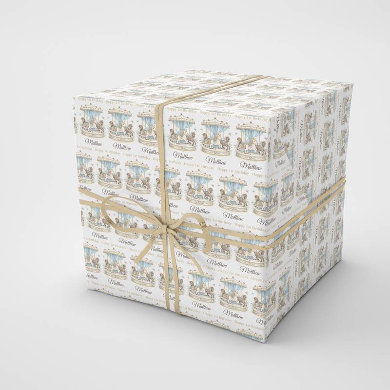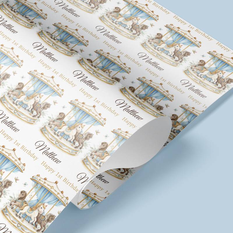 Celebrate a magical milestone with our Personalised Carousel Birthday Wrapping Paper, featuring an elegant vintage carousel with beautifully illustrated horses, soft blue drapery and delicate gold detailing. Personalised with any name, this premium wrapping paper creates a stunning presentation for baby boy first birthday gifts, any age birthday and special celebrations.