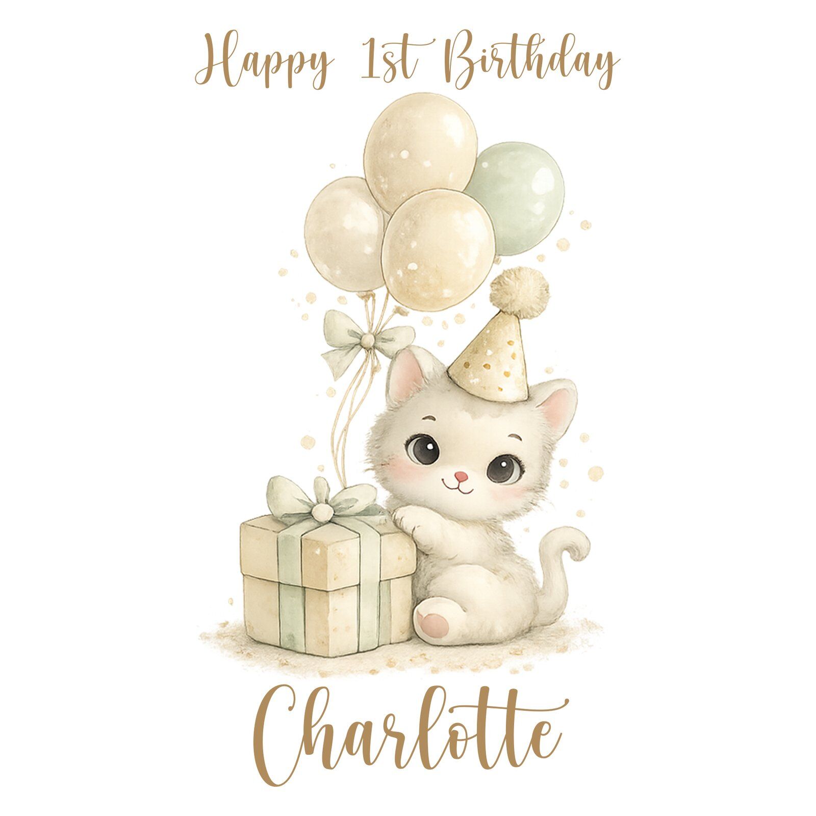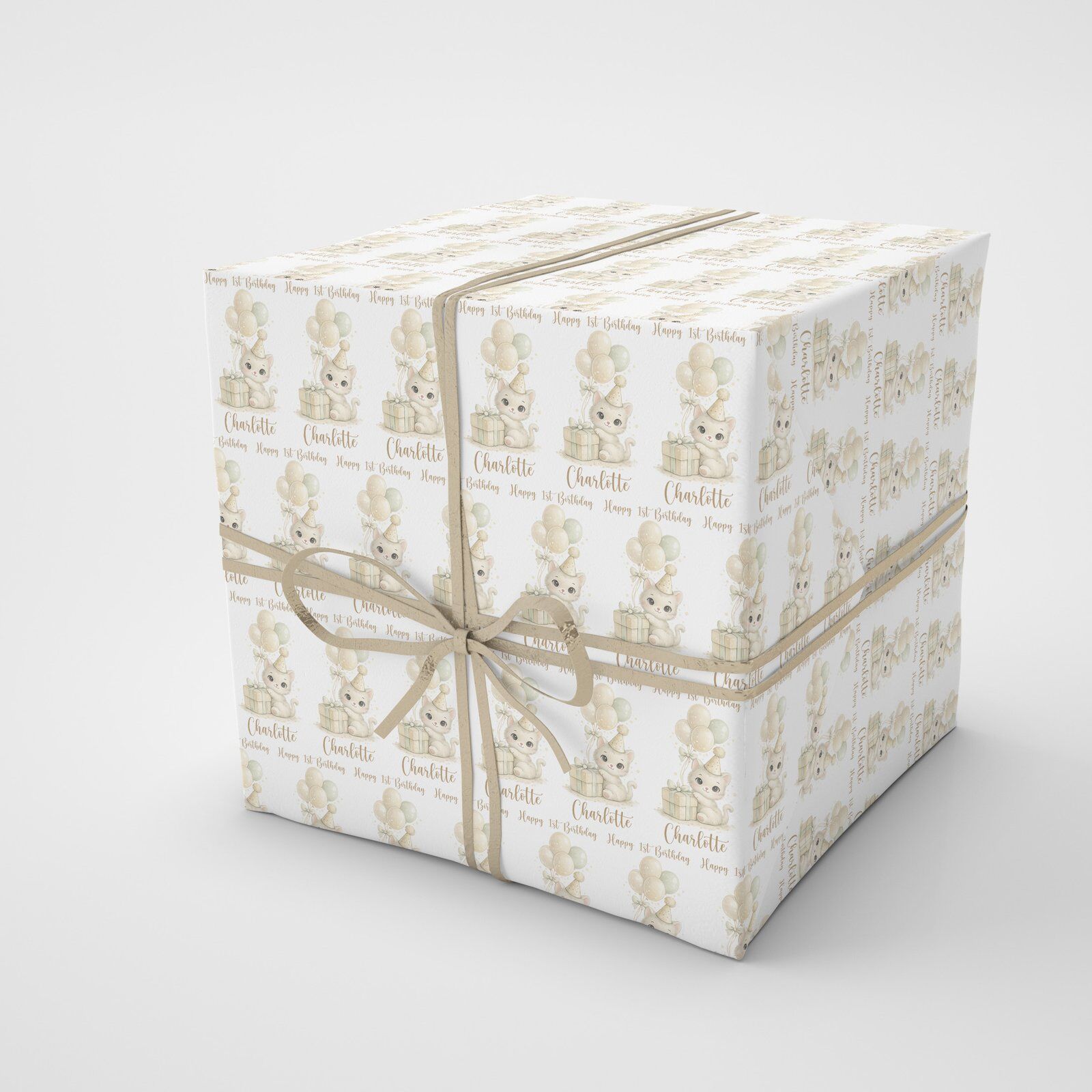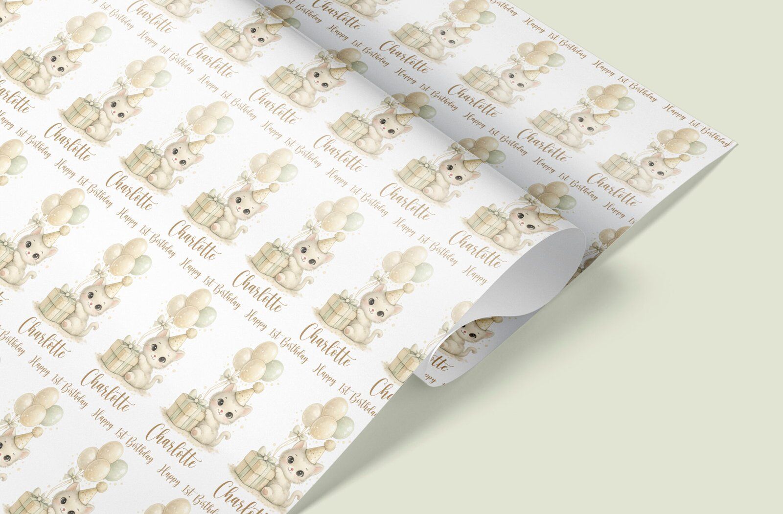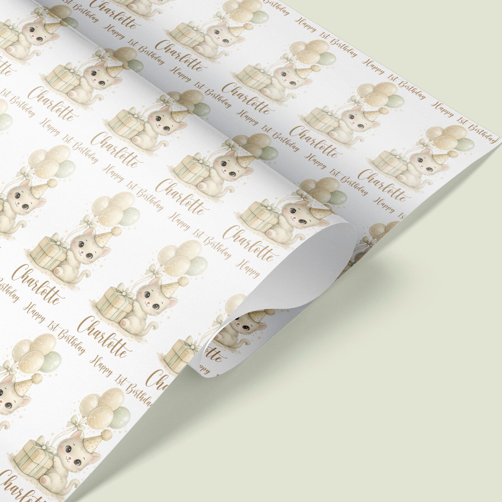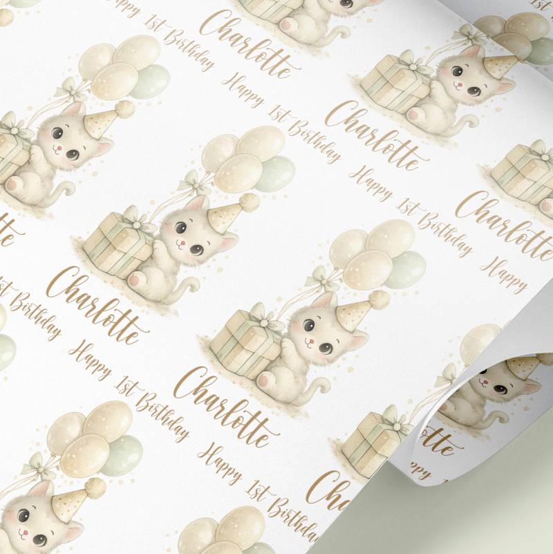 Adorable kitten wrapping paper personalised with any name and age. Printed on luxury matte paper, rolled in a tube and dispatched fast from our UK studio.