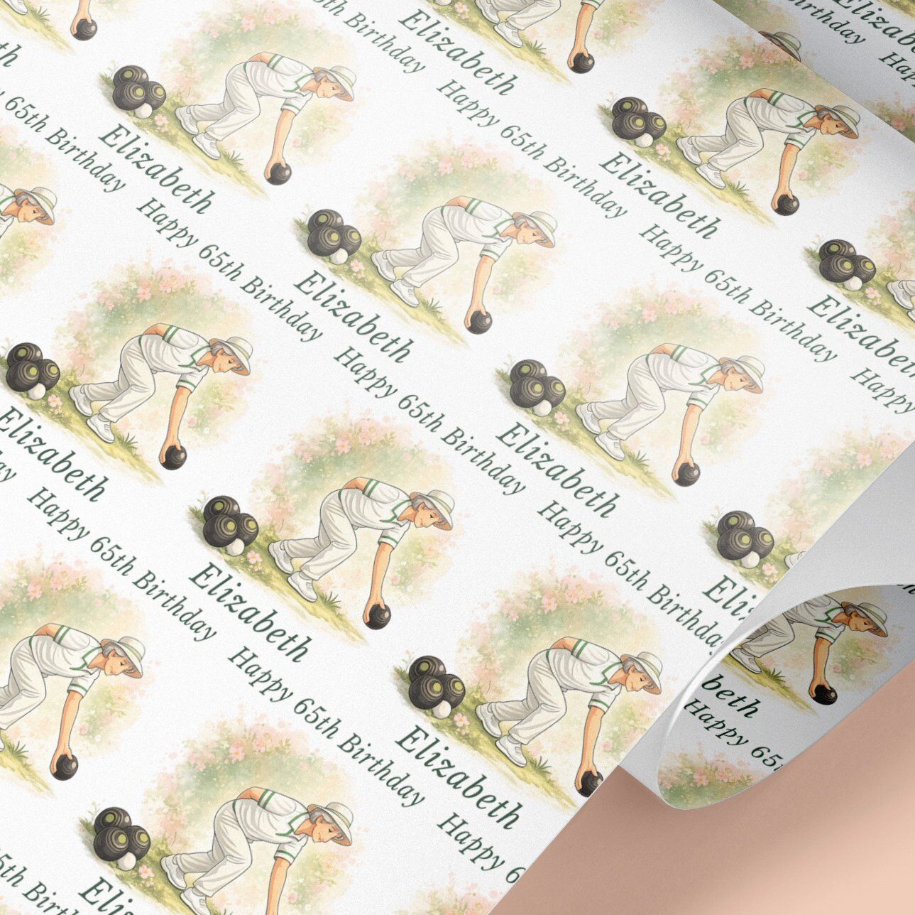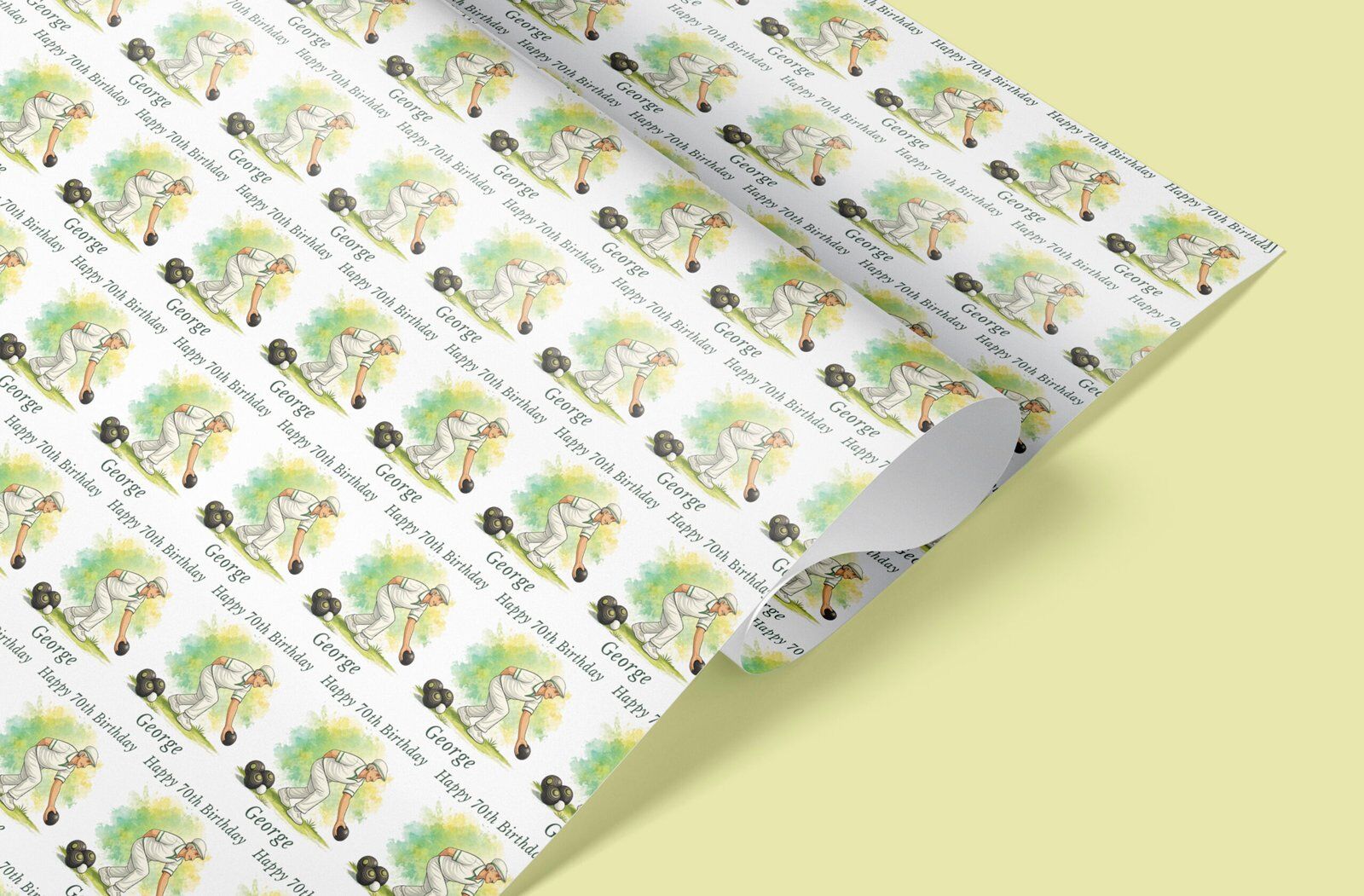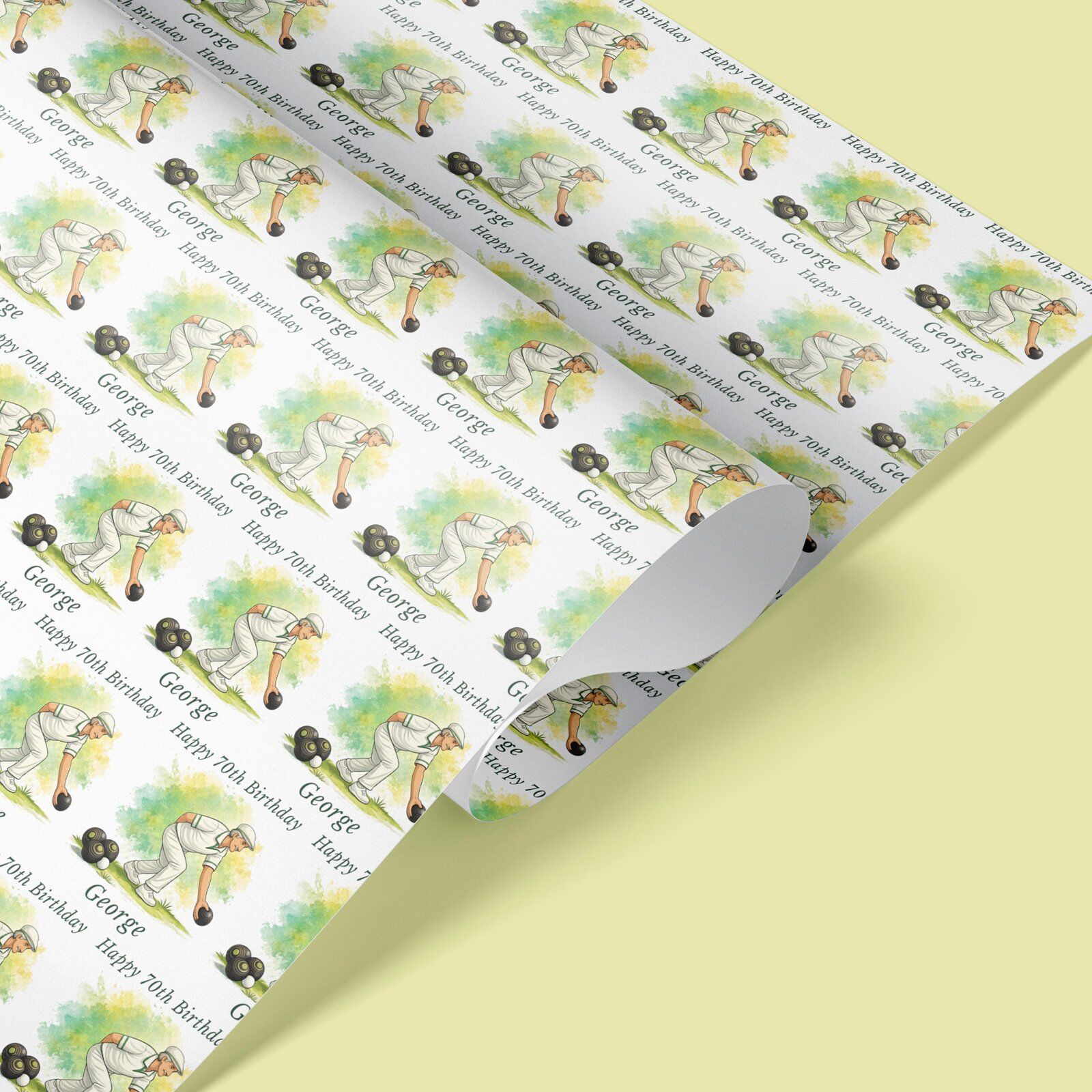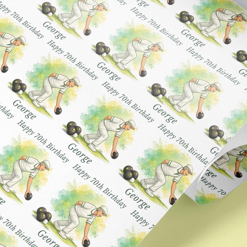 Personalised lawn bowls wrapping paper with a choice of male or female design. Any name, any age. Rolled not folded, recyclable & tracked UK delivery.