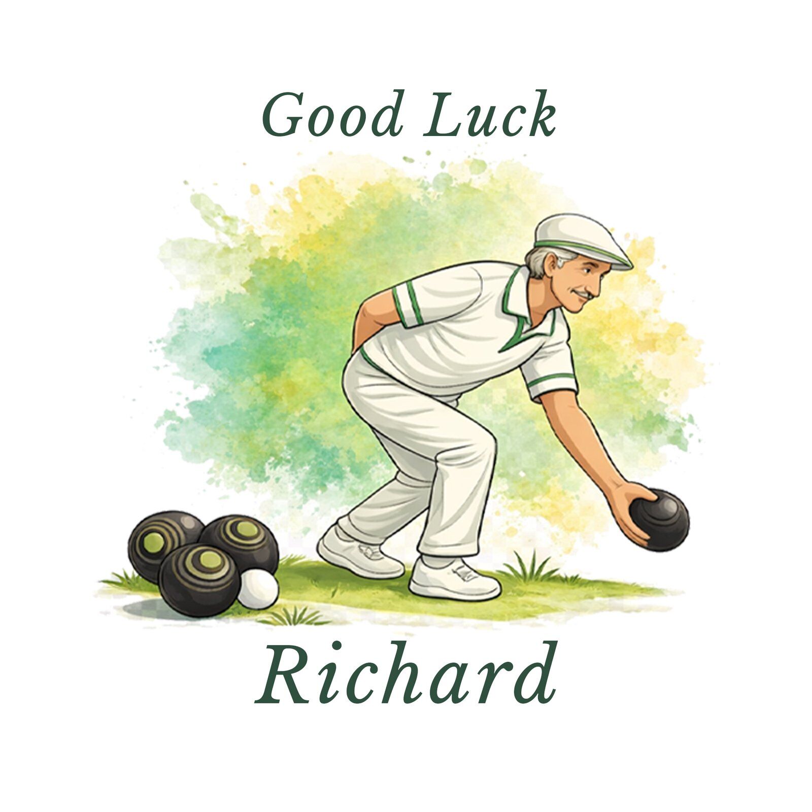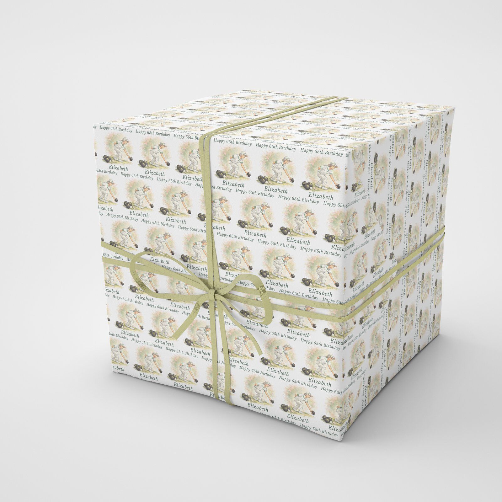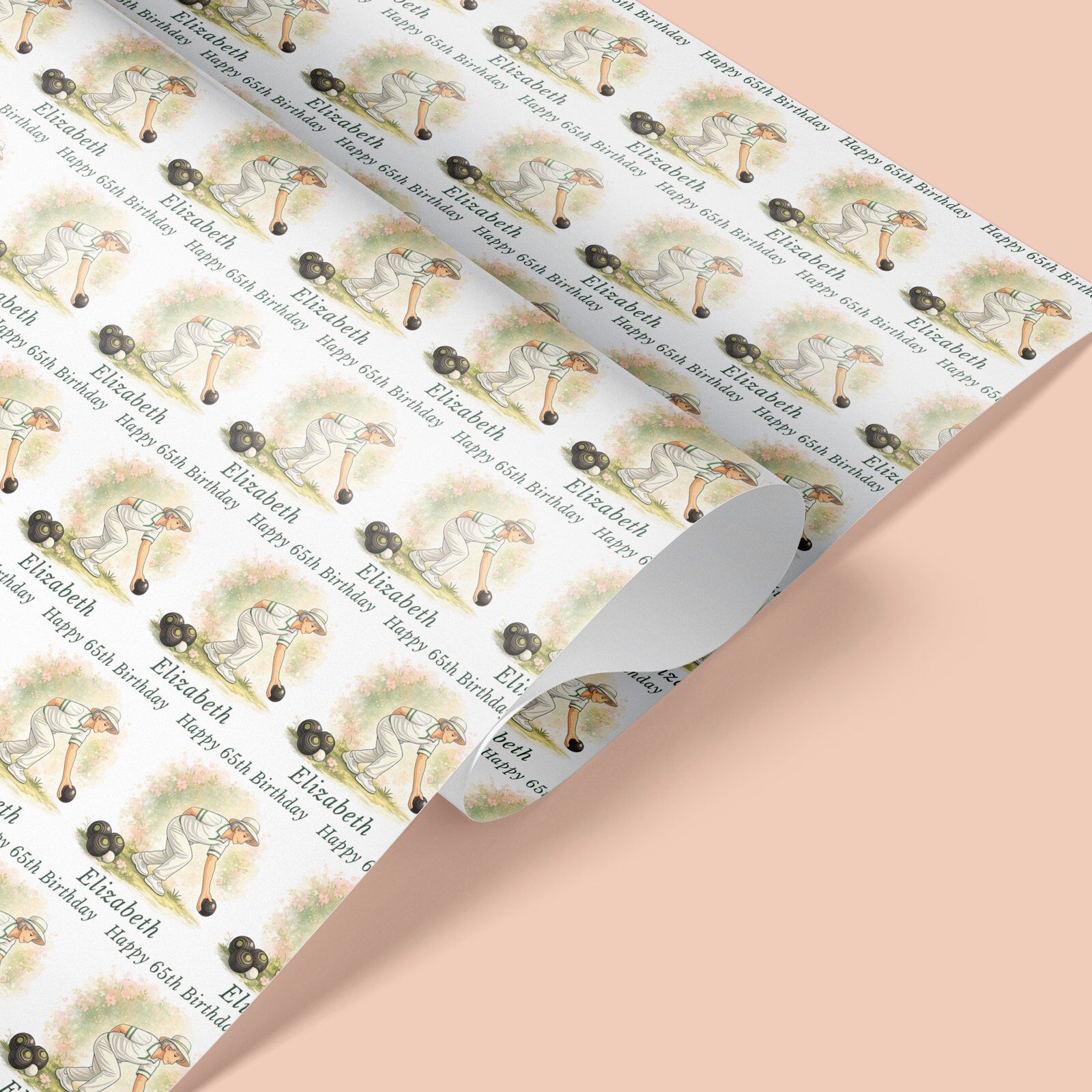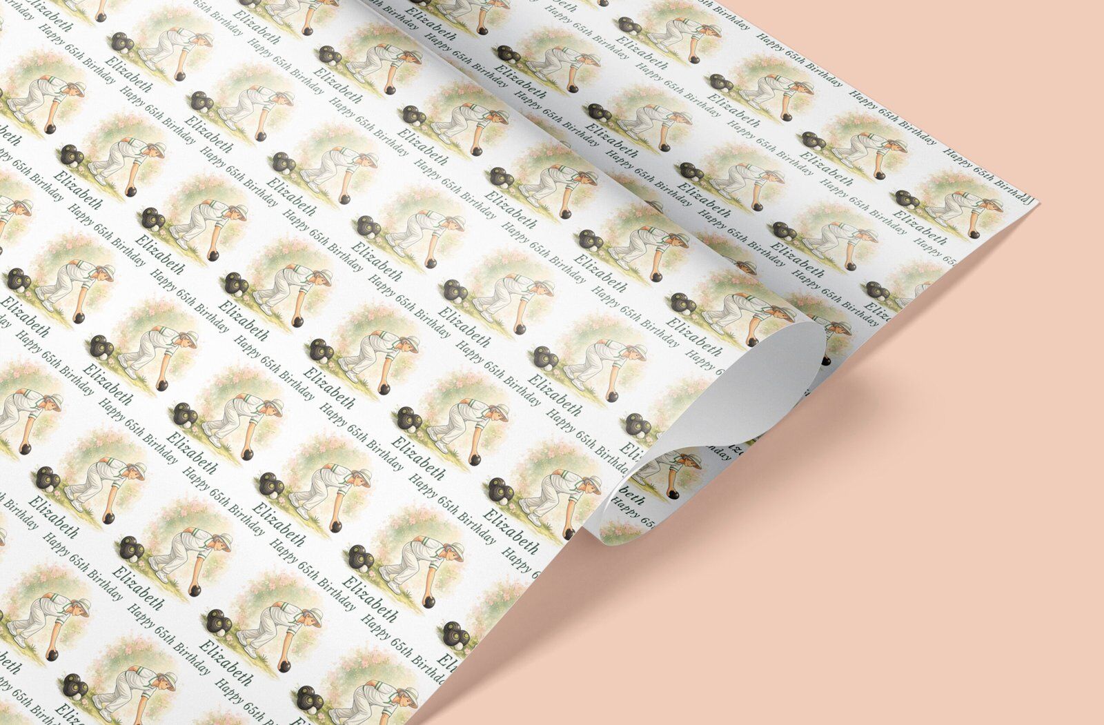 Personalised lawn bowls wrapping paper with a choice of male or female design. Any name, any age. Rolled not folded, recyclable & tracked UK delivery.