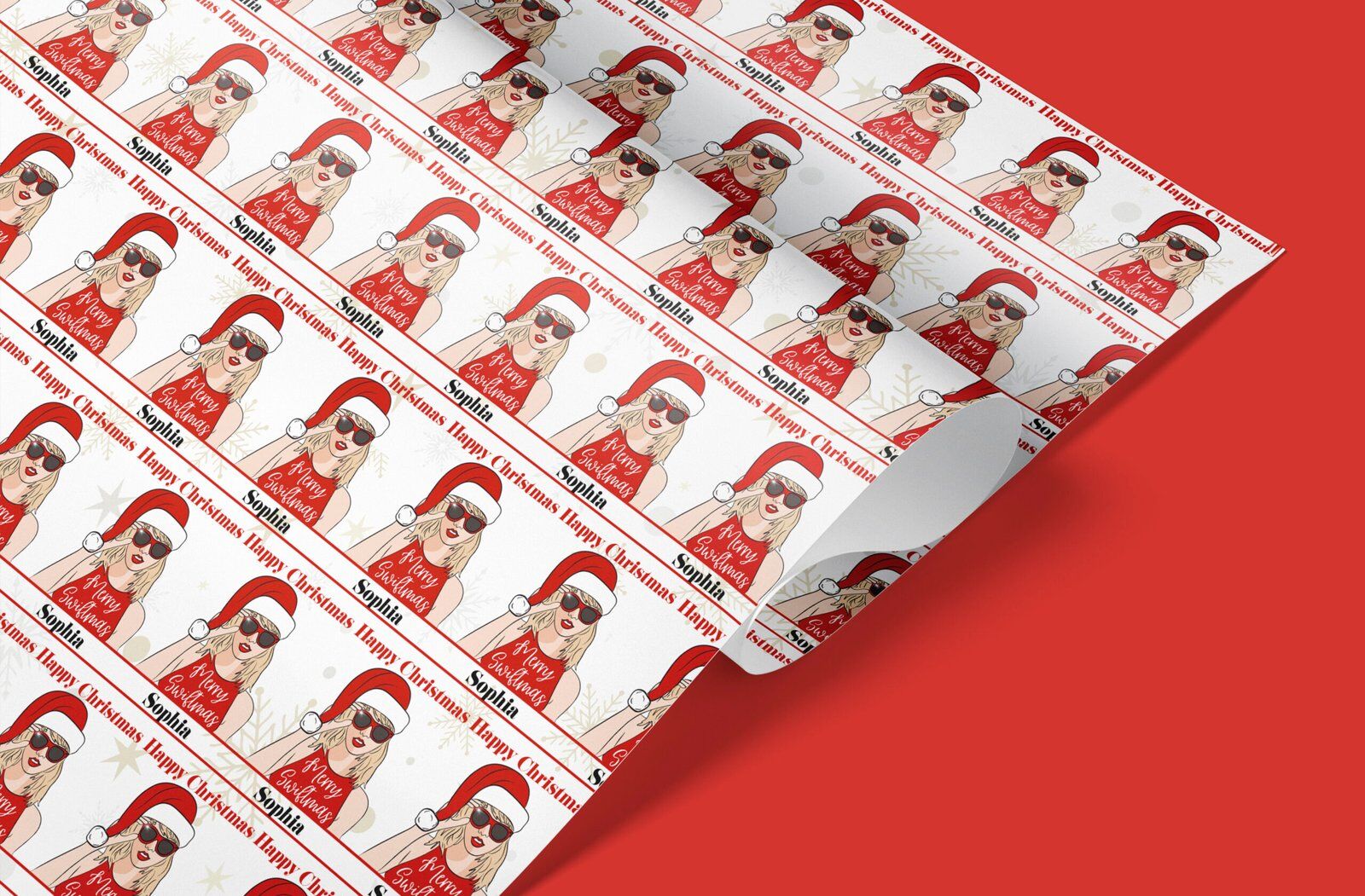 Bring a fun, stylish twist to your Christmas gifting with our Personalised Merry Swiftmas Wrapping Paper, inspired by the iconic look of a popular blonde pop star who has taken the world by storm. Featuring a fashionable festive illustration wearing a Santa hat, sunglasses and bold red outfit, this design captures the playful spirit of the holiday season with a modern celebrity-inspired edge.