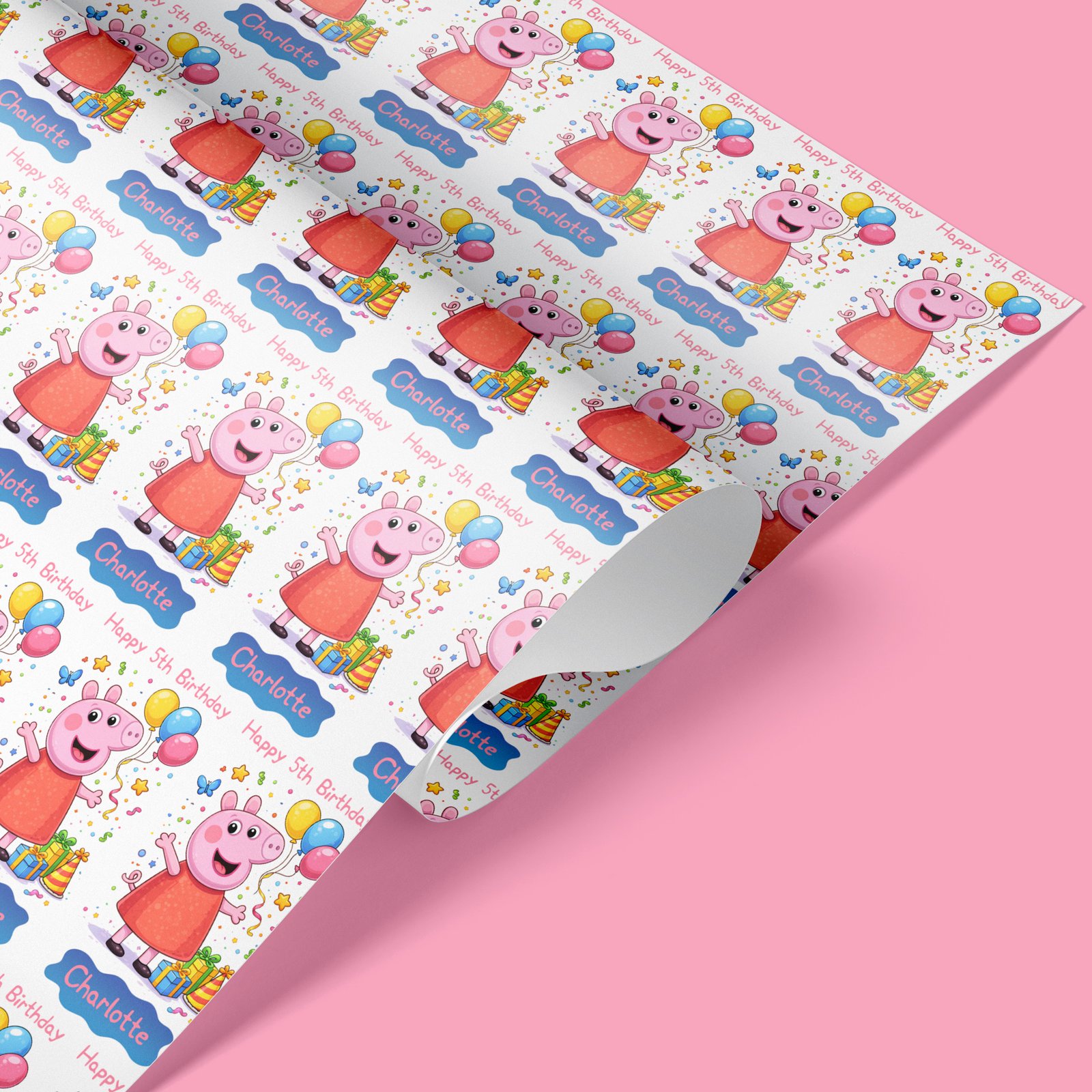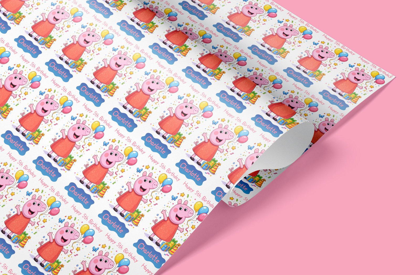 Bright, fun personalised pink cartoon peppa pig themed wrapping paper printed with any name and age. Rolled for crease-free delivery in 100% recyclable tubes.