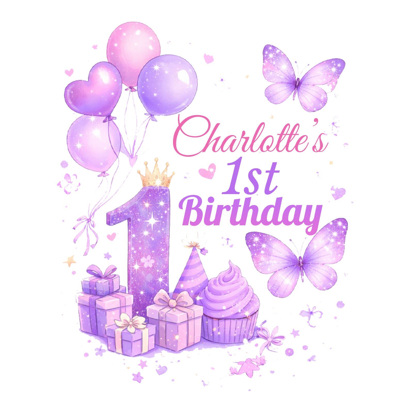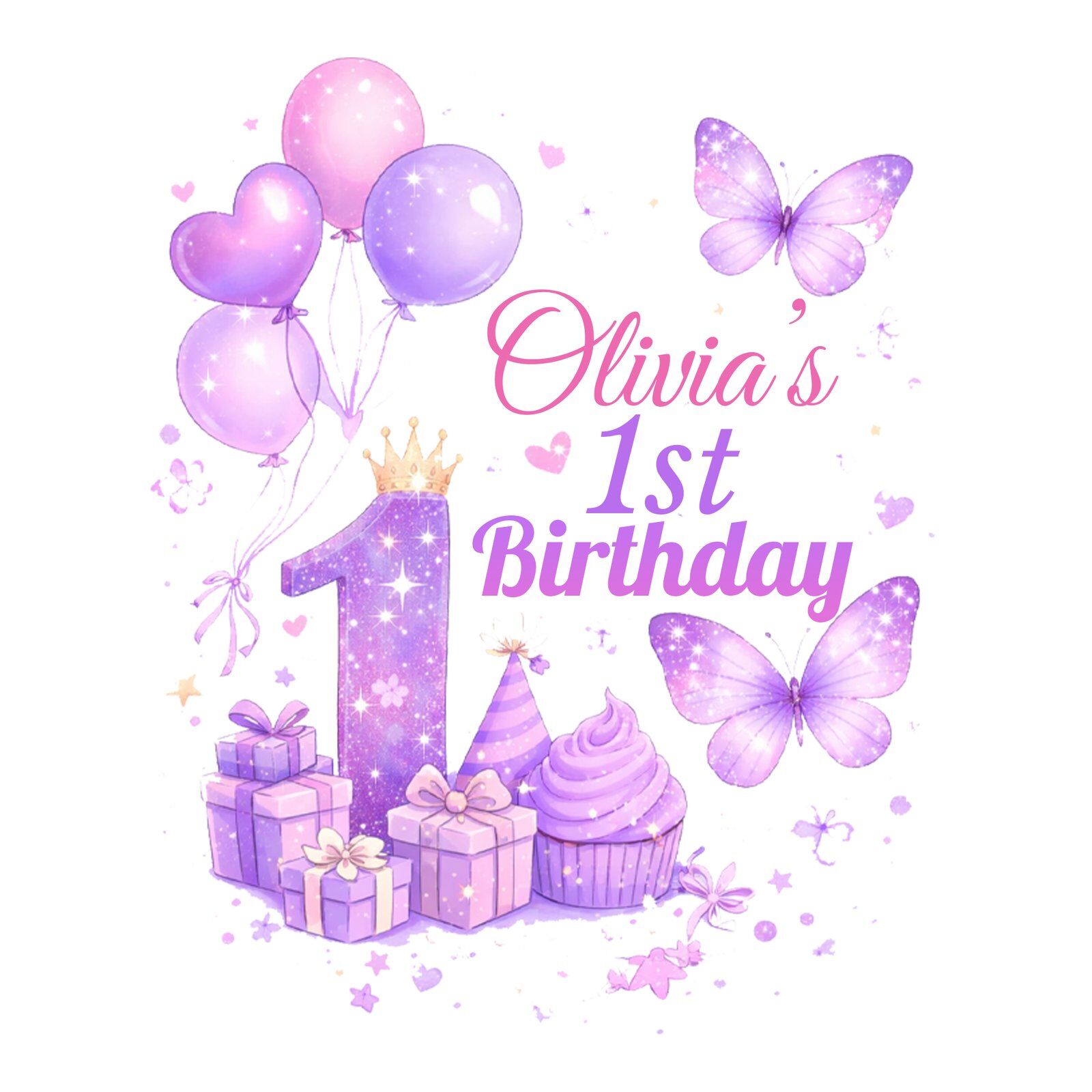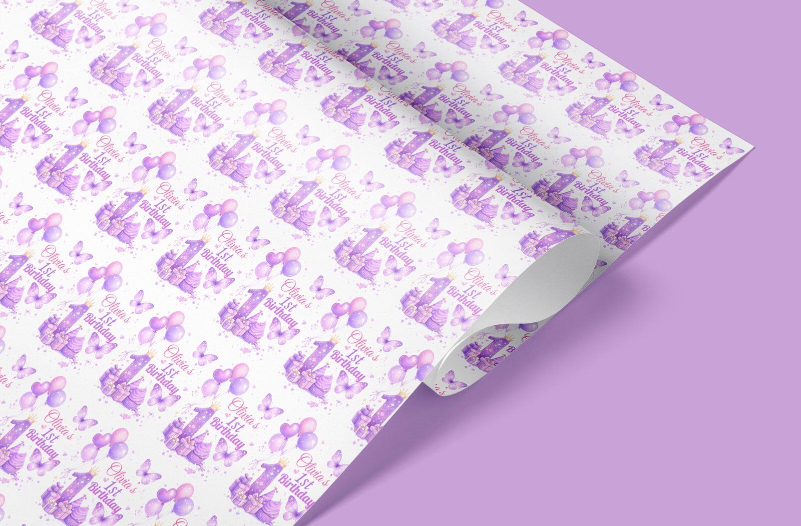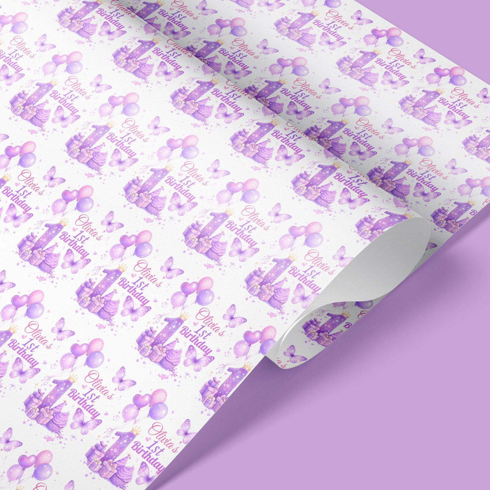 Personalised Purple Butterfly 1st Birthday Wrapping Paper – Custom Name Gift Wrap (1m–8m Rolls)
