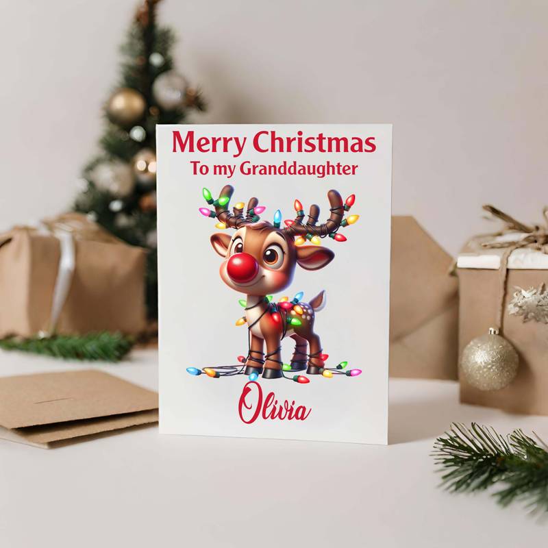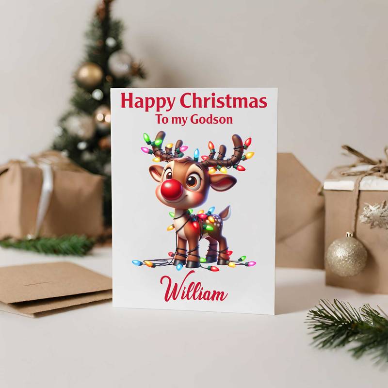 Send festive cheer with our Personalised Rudolph Christmas Card! Add any name or relationship. Printed on luxury 300gsm linen cardstock with envelope included.