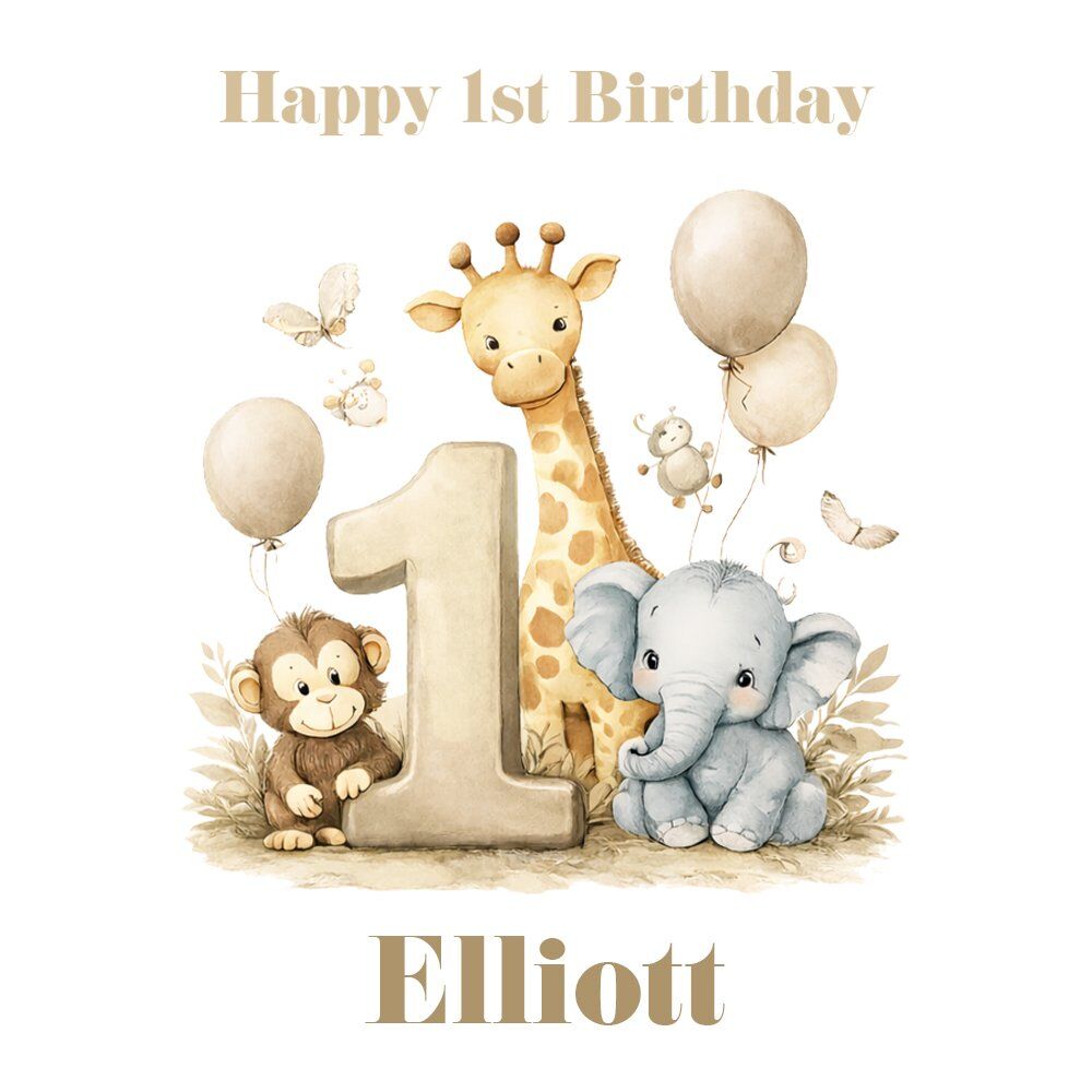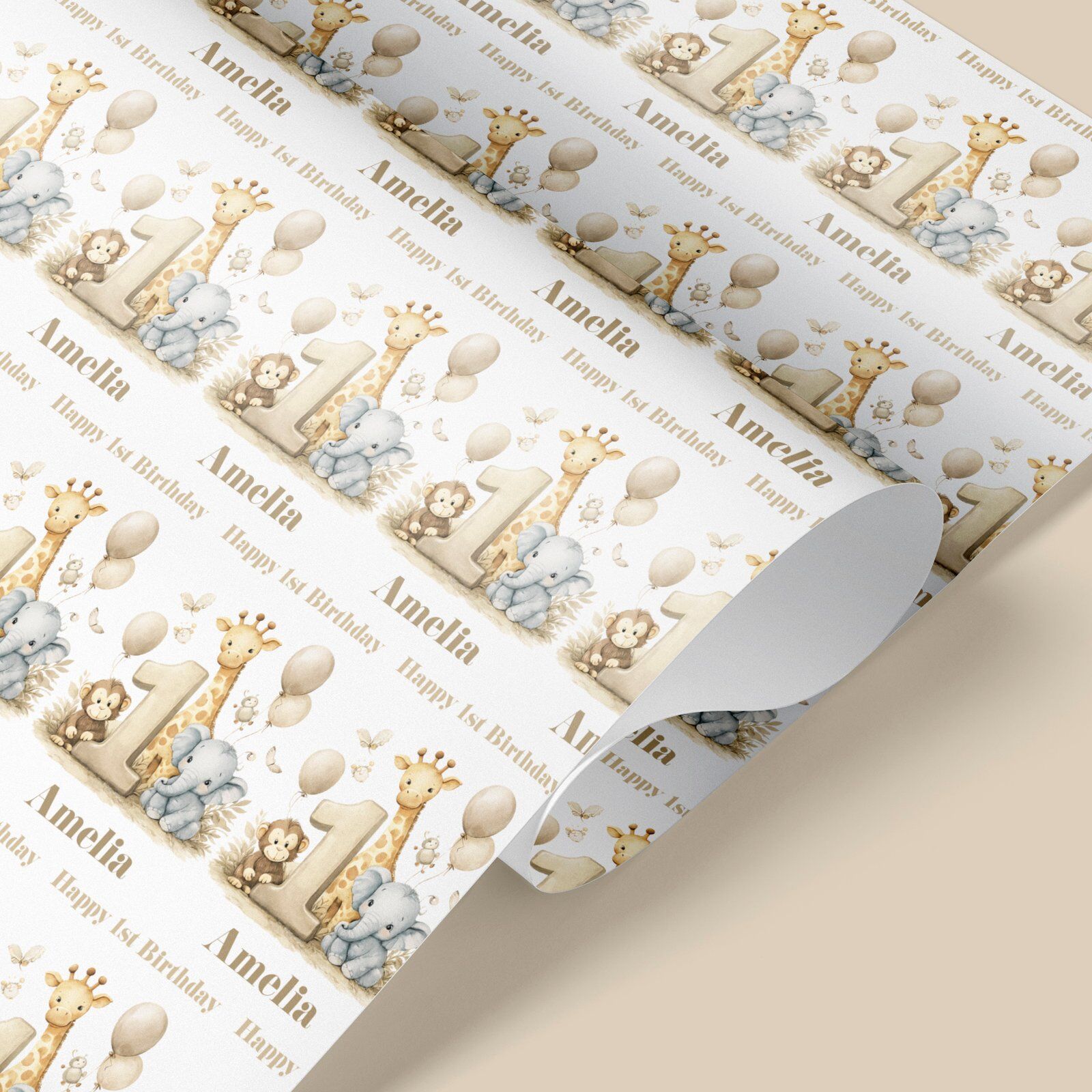 Celebrate a special milestone with our Personalised Safari 1st Birthday Wrapping Paper, featuring adorable safari animals including a giraffe, elephant and monkey beside a large number 1. Printed in soft neutral tones and personalised with any name, this premium quality gift wrap is perfect for baby boys, baby girls or gender-neutral birthday celebrations. Also available in blue, pink and green versions.