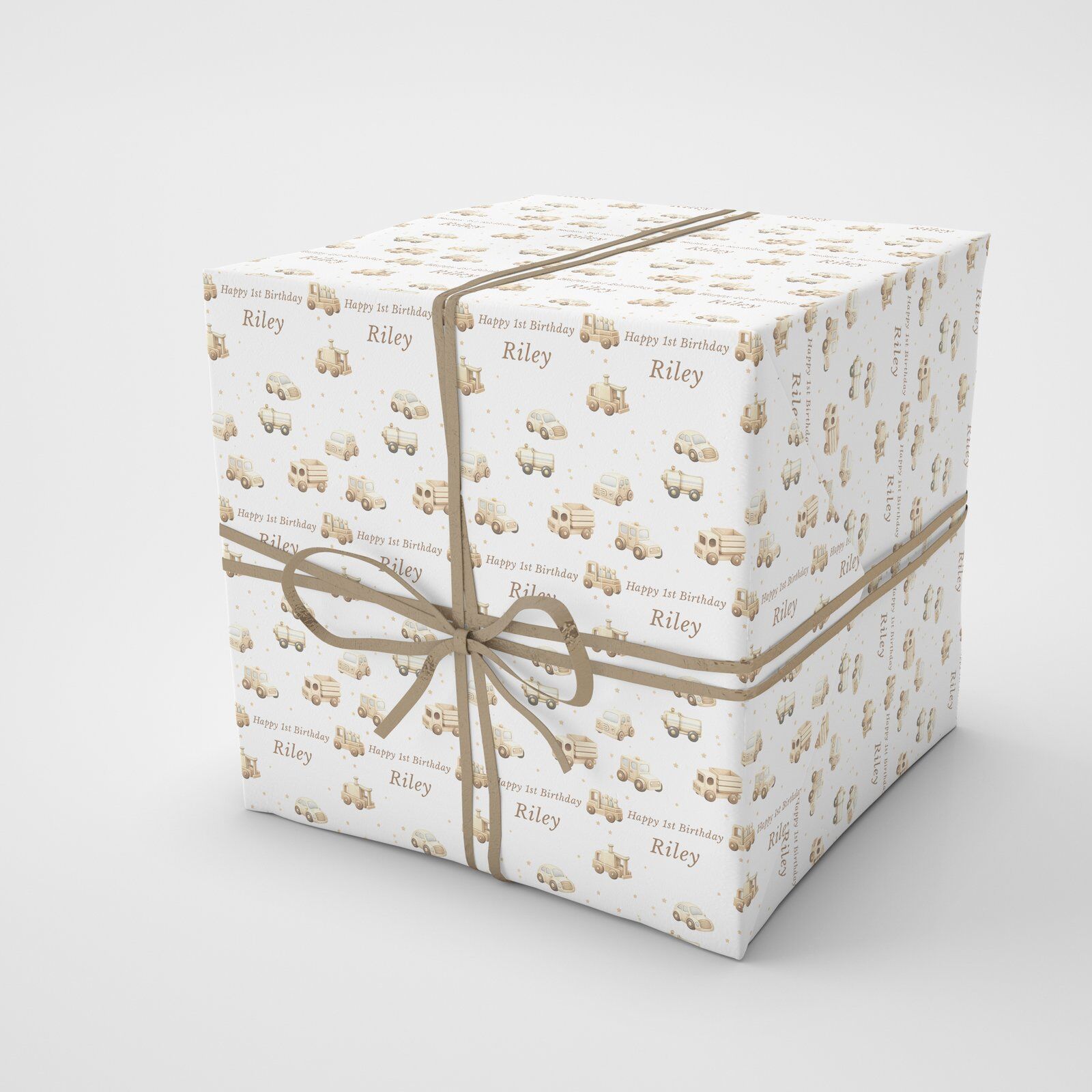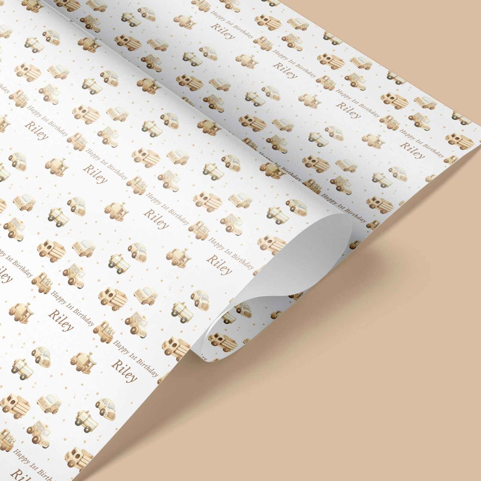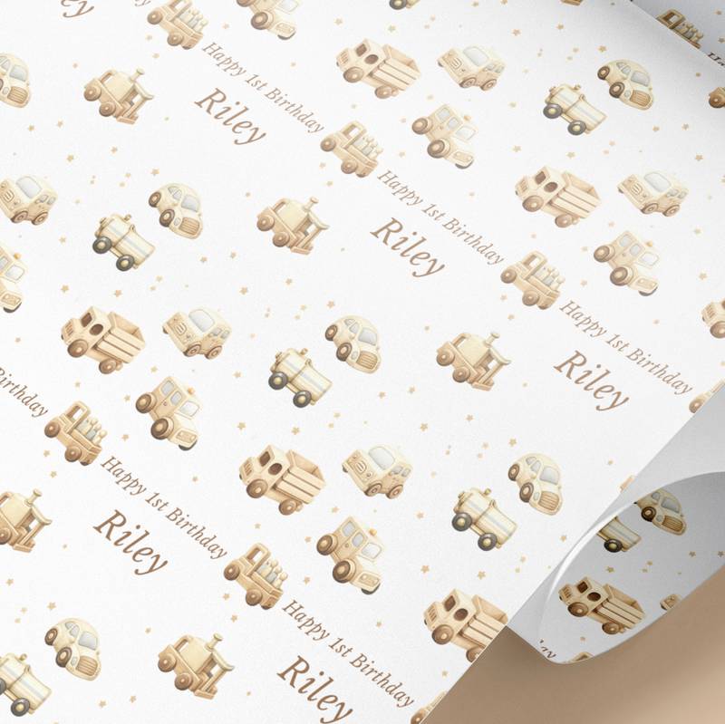 Beautiful personalised wooden toy cars wrapping paper, perfect for birthdays, baby milestones and toddlers. Customise with any name and age for a thoughtful finishing touch that makes every gift extra special.
