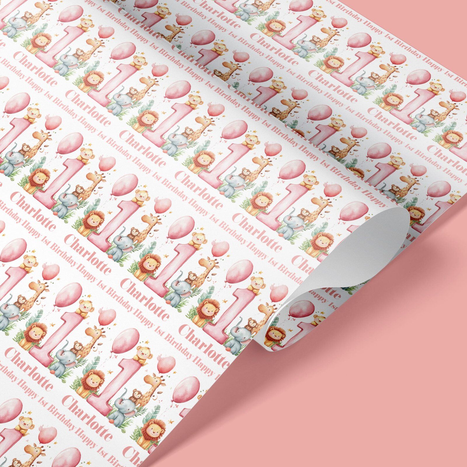 1st Birthday Pink themed Safari Animals Wrapping Paper