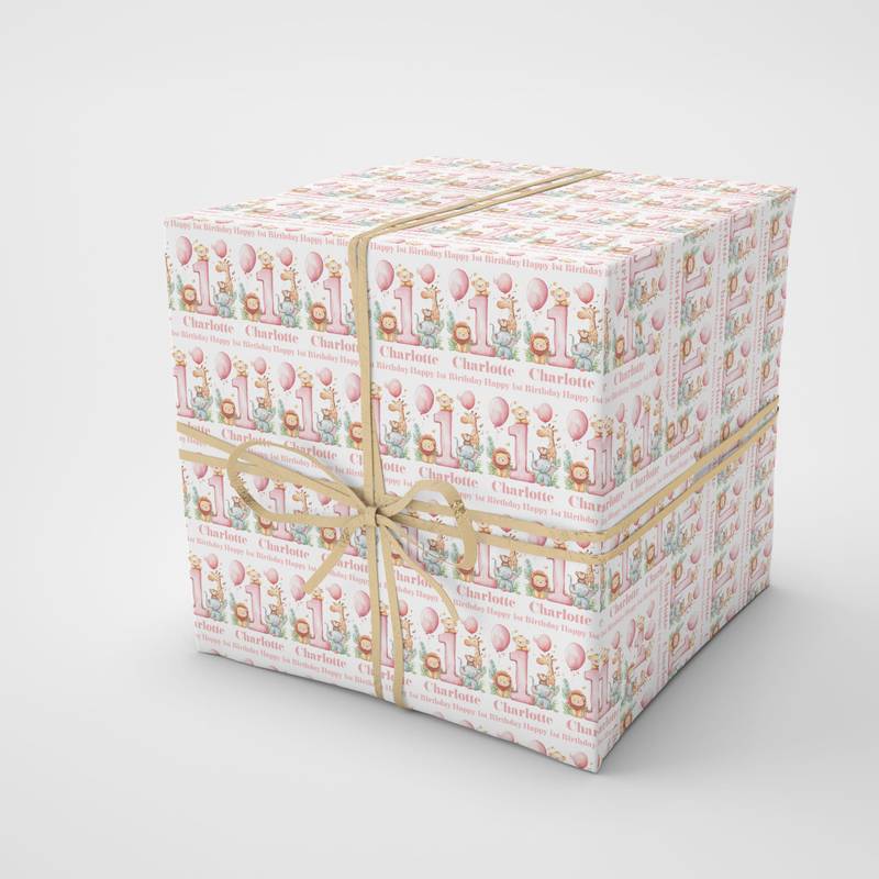 1st Birthday Pink themed Safari Animals Wrapping Paper