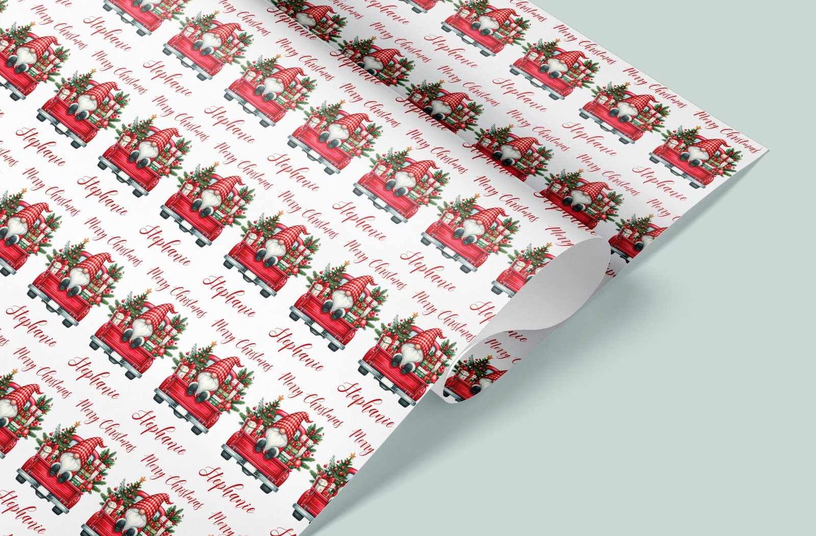 Make your Christmas gifts unforgettable with our Personalised Red Gnome Christmas Wrapping Paper – where festive charm meets premium quality. Featuring an adorable Christmas gnome in a red checkered hat, seated in a bright red truck overflowing with presents, trees, and decorations, this custom gift wrap adds a heart-warming, personal touch to every parcel.