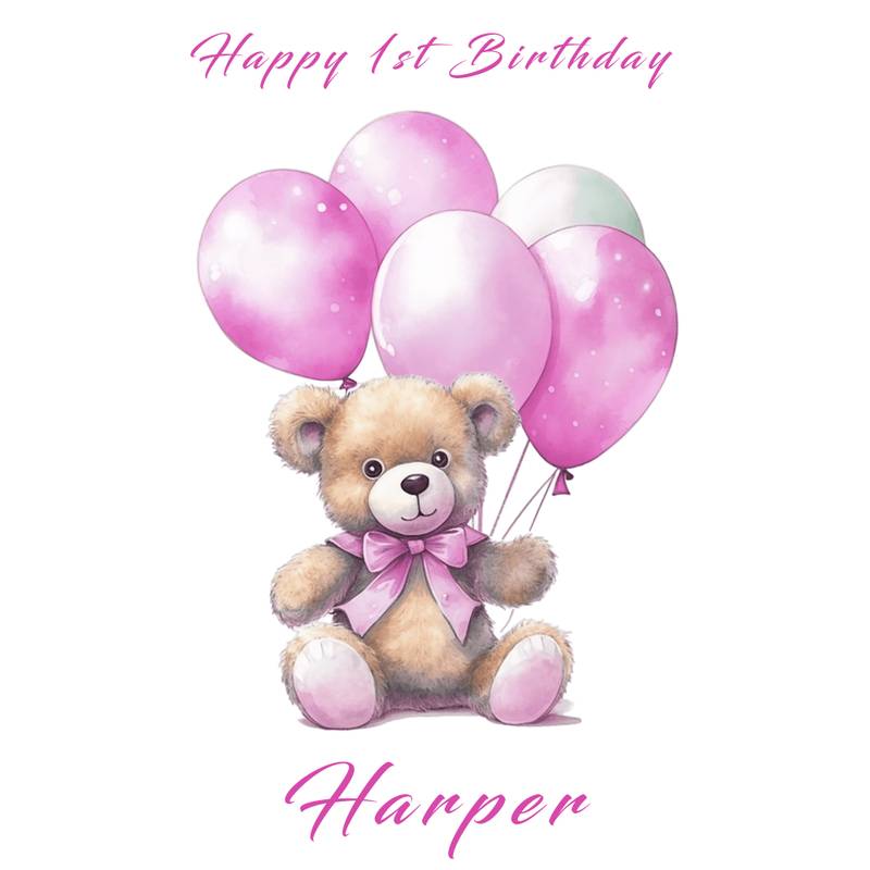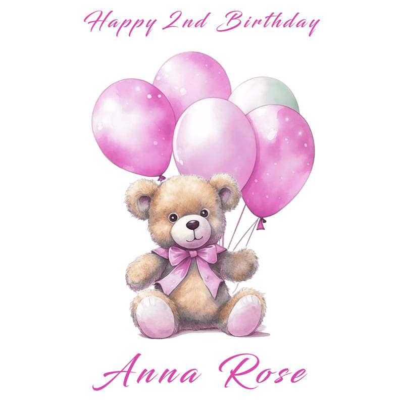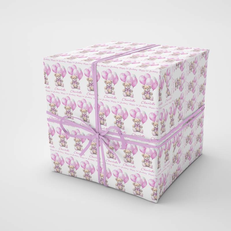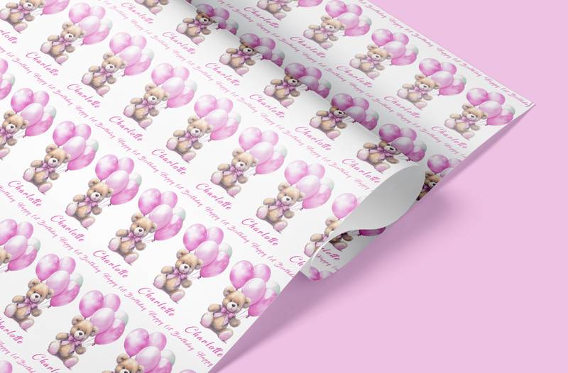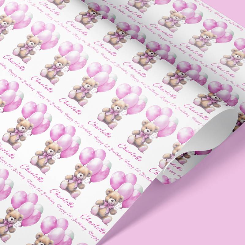 Personalised Pink Teddy Bear Wrapping Paper with Balloons